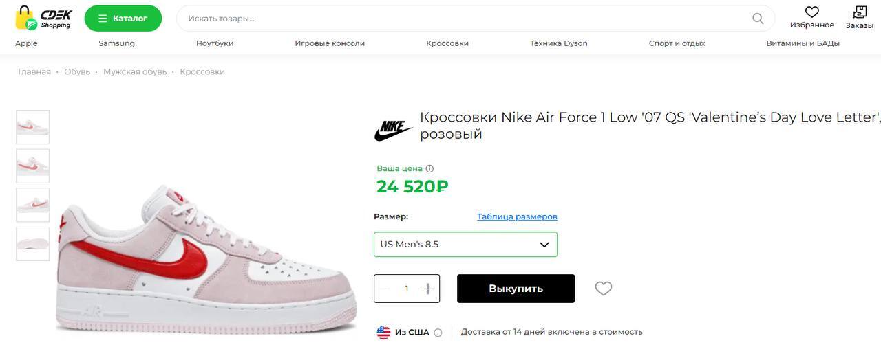 Начну издалека: искала, где купить кроссы – Nike St Valentine’s (лимитка ко дню святого валентина). В разные годы выходили разные лимитки, все есть кроме этих. Долгая гуглежка показала, что раньше они были на Yoox, Farfetch, а теперь только у перекупов на авито ( средняя цена около 31 – 33 к) и были сомнения в оригинальности (не было полного комплекта: бумаги, шнурков, а также смущала фотка швов под стелькой). В итоге вышла на сдэк шоппинг. Там разная цена на размеры, система как у Фарфетча, как я поняла. Мой размер 8.5 мужской или 10 женский – он оказался самым дешевым. На момент заказа 23 980 р. Меня устроила эта цена, но возникло сомнение – я начиталась отзывов о Сдэк Шопинге, расстроилась со всей силы, ибо репутация сложилась неоднозначная. В итоге, я пришла к мысли, что Сдэк же пользуется своей логистикой, а сам СДЭК как транспортная компания меня ни разу не подводил, да и сдэк форвард тоже вовремя все привозил в целостности
