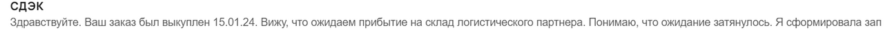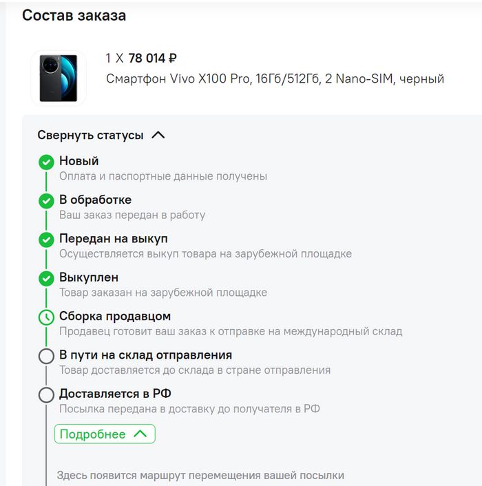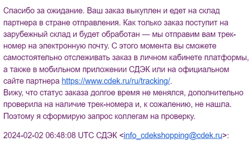 Но на тот момент я знал, что идти телефон будет долго, но всё же я оказался не готов к тому насколько всё затянется. Начнём с того что 11.01.2024 я оплатил заказ и процесс должен был запуститься. После пары дней ожиданий статус перешёл в состояние "Передан на выкуп" на котором он и провисел около месяца, смотреть на неизменный статус я больше не мог, поэтому написал в техническую поддержку, в начале февраля, что бы узнать актуальный статус, на что получил ответ:
