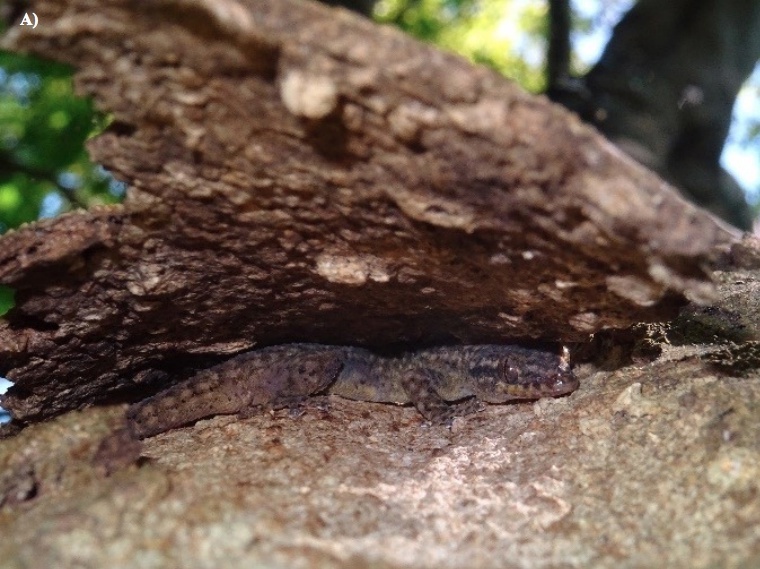 Фото 13. A) Гондурасский листовидный пальмовый геккон Phyllodactylus palmeus в убежище под корой дерева. Автор: Tom W. Brown