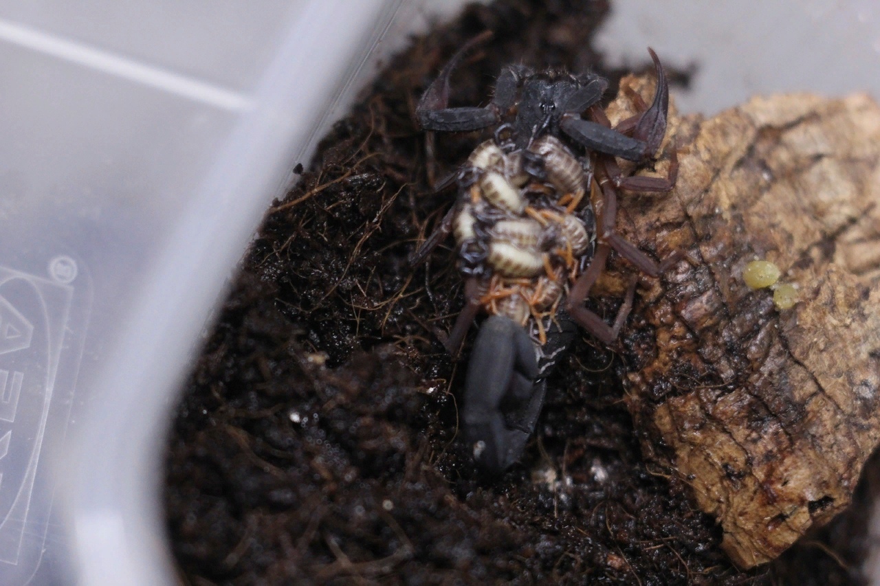 Потомство оказалось вполне крепким и жизнеспособным, несмотря на инбридинг (близкородственное скрещивание). Однако часть скорпионов из выводка первой самки, успешно перелиняв в скорпионов первой линьки, по неизвестной причине погибла на самке, выжили 4 особи, 4 обнаружены мертвыми, вероятно, еще несколько скорпионов съедены самкой (так как нимф на фото более 10, а на субстрате погибшие не были обнаружены).