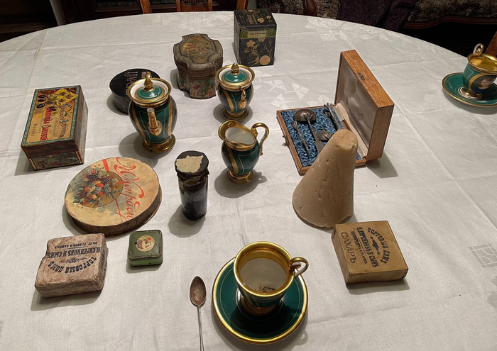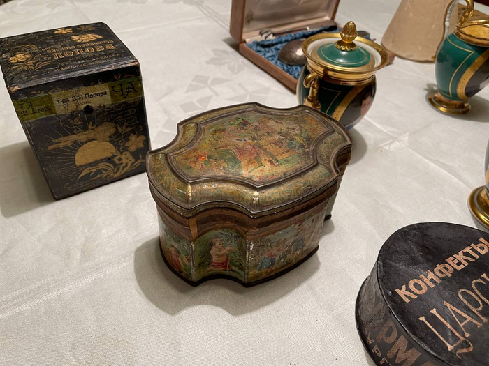 Есть и сахар - коническая сахарная голова и рафинад торгового дома «Евреинов и сын». Коробка с чайным набором - тогда подобные были в каждом доме. В неё входит ситечко, лопаточка для чая, щипцы для сахара и вилочка для лимона...