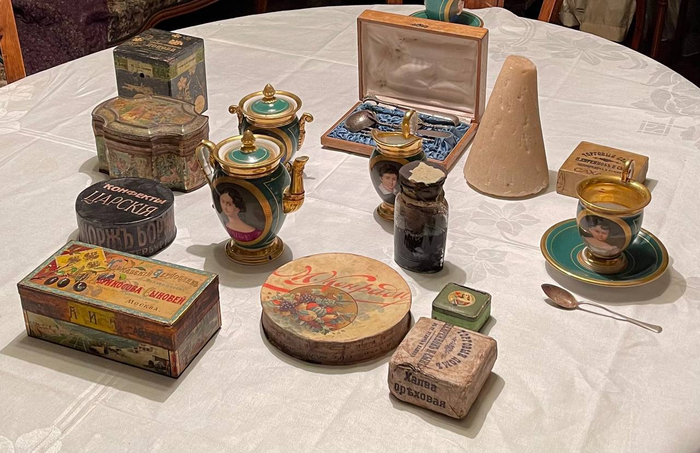 К чаю поданы жестяная коробка «Кавказский чернослив в шоколаде» товарищества «Абрикосова и сыновей», бонбоньерки (картонные коробки) «Конфекты царские» товарищества «Жорж Борман» (слово «конфета» до 1917 года было мужского рода и писалось с «к» - «конфект»), товарищества Конради, шоколад Лагодина (все это знаменитые дореволюционные фирмы). Рядом «Ореховая халва» торгового дома «Евреинов и сын». Варенье, коробка знаменитого чая Попова.