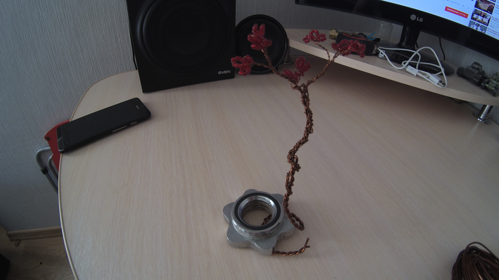 Наконец-то закончил свой долгострой. Подробно описывать процесс не буду, уже делал это в прошлом посте про бонсай из бисера. Специально не стал делать много "листвы"-попытался создать эффект умирающего дерева.