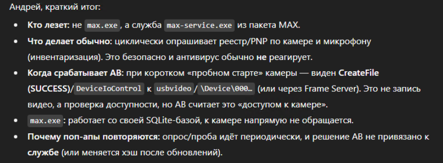 Воспользовался Procmon. Зафиксировал журнал обращений max-service.exe. Передал ЧатуЖПТ на анализ. Он-то мне и рассказал, что обращения происходят не в качестве записи с камеры, а просто для проверки: