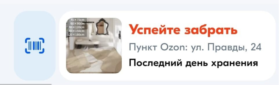Я передала информацию мужу, но он уже был в нужном ПВЗ. Там чисто механически сотрудник нашел наш ковер. Муж попросил прислать ему новый штрихкод, т.к. этот не срабатывал, но как можно догадаться, других вариантов кодов у меня не было, поэтому