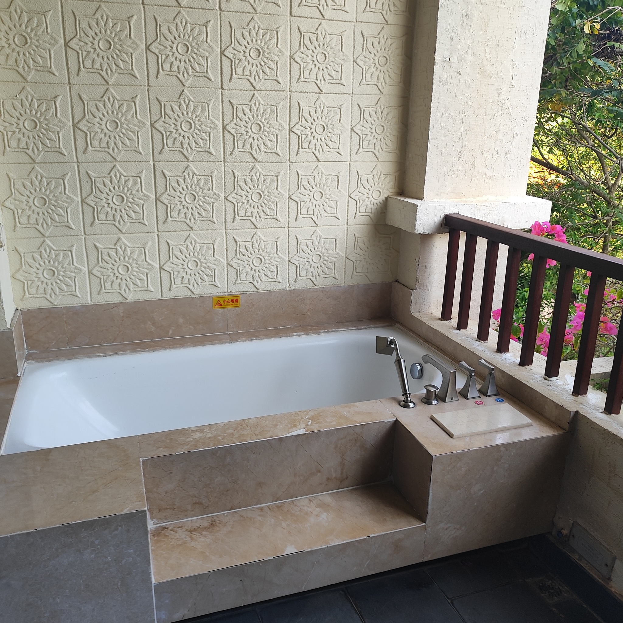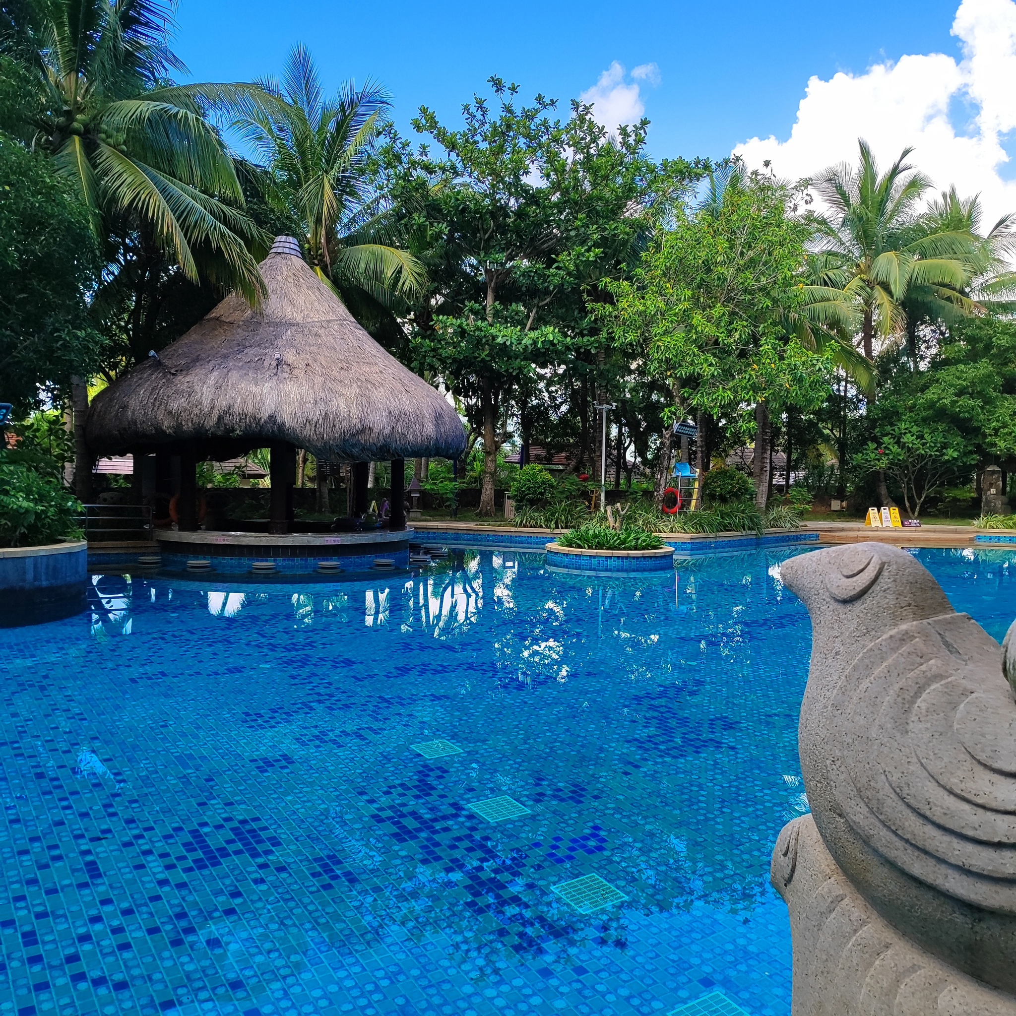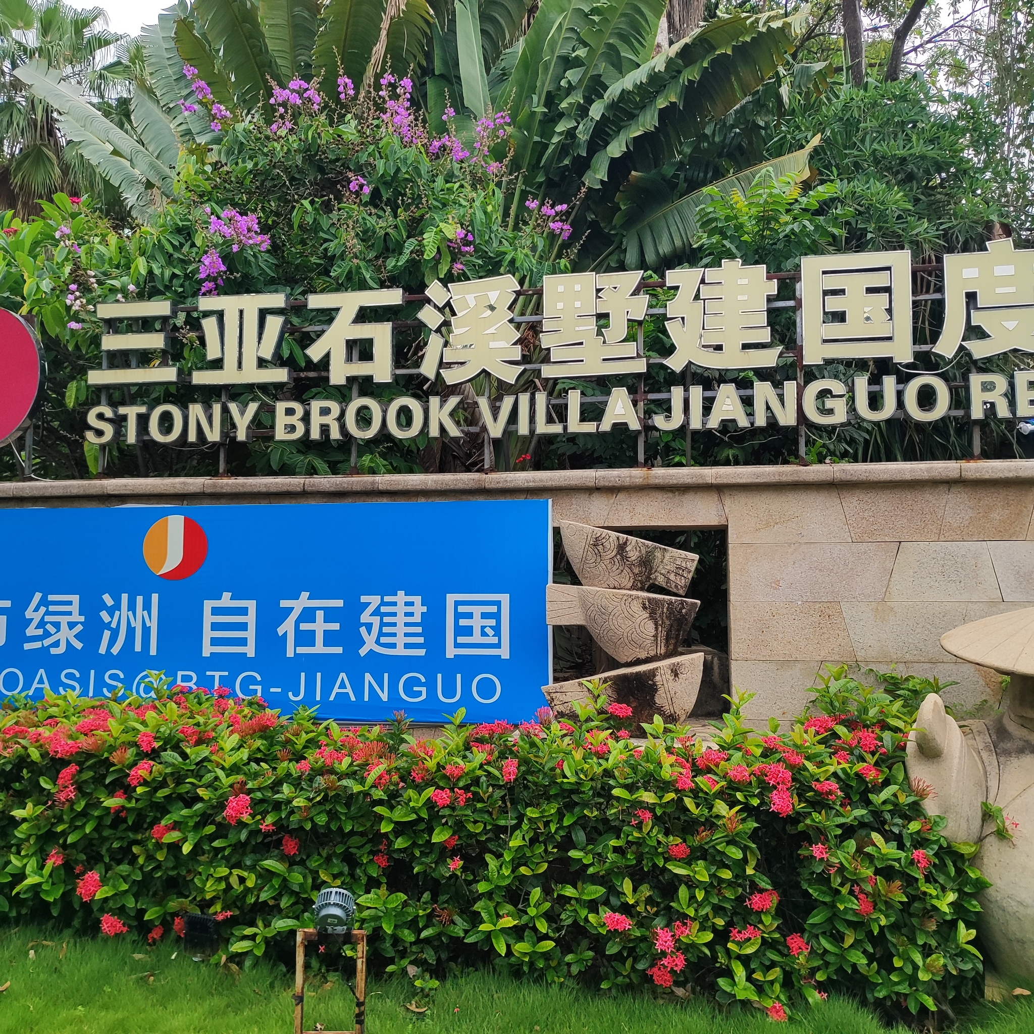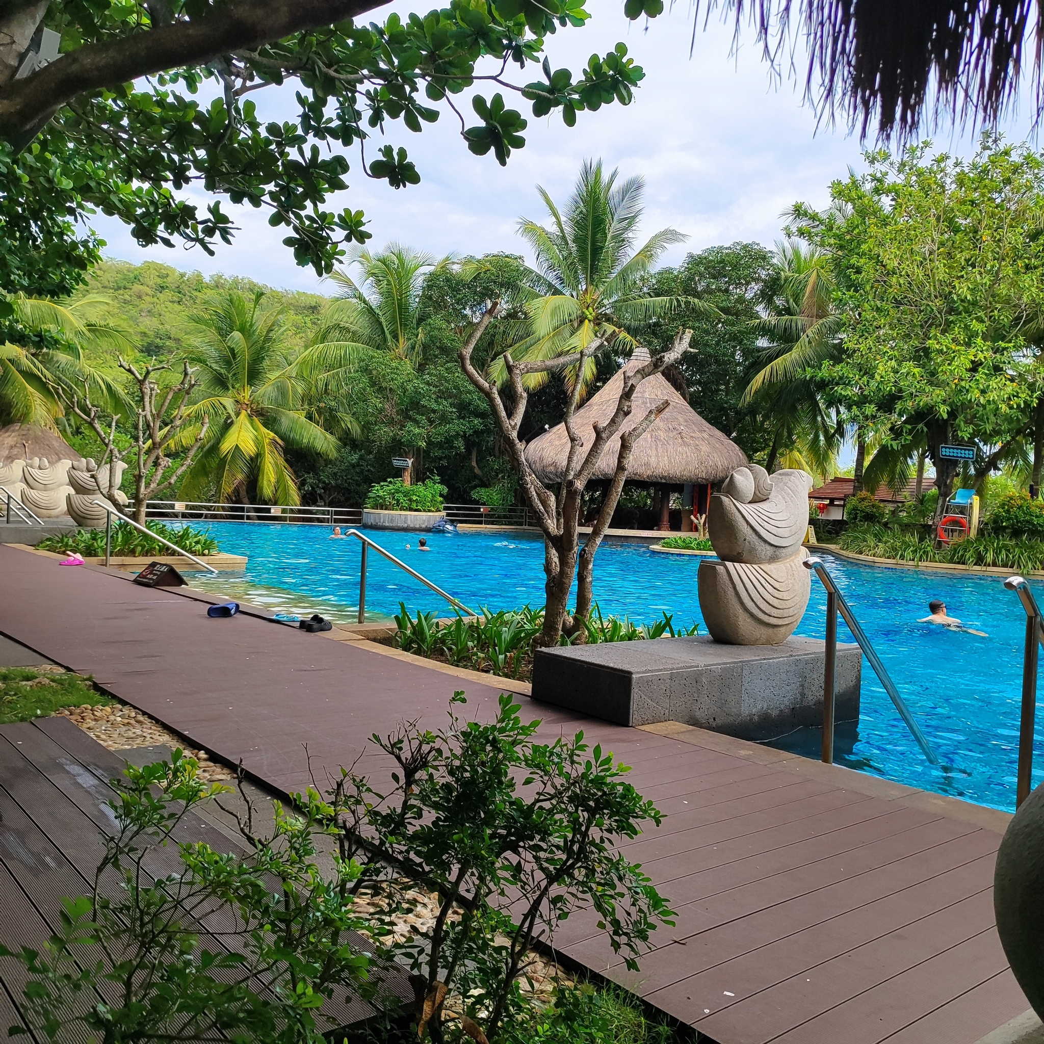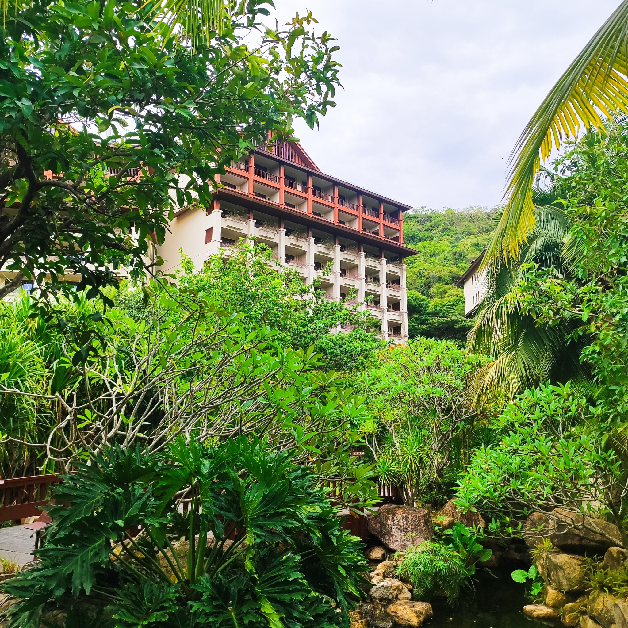 Отель 5 звёзд, большая территория у подножия горы, тропический сад, протекает ручей. На территории много вилл и в конце три девятиэтажных корпуса. Большой бассейн и детский бассейн. Ресторан. Номер большой и большой балкон. На балконе ванна. Оформление в балийском стиле, пол в гранитной плитке, стены в покраске, вся мебель из дерева, душ и туалет из матового стекла. Пластмассовые только розетки и выключатели, всё остальное натуральное экологичное. Балкон выходит в сад, поют птички, носятся белки. Если хотите вид на море, надо селится выше пятого этажа. Еда на завтрак китайская в основном, выбор очень большой. Привычная еда впрочем тоже есть - чай, кофе, молоко, йогурт, яичница, выпечка, пирожные, соки, фрукты, сосиски.