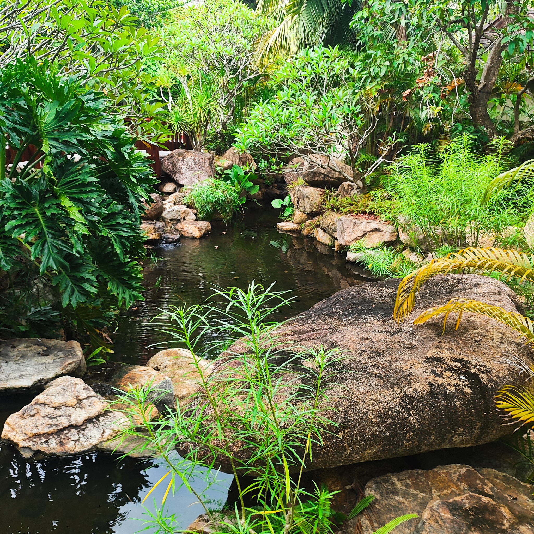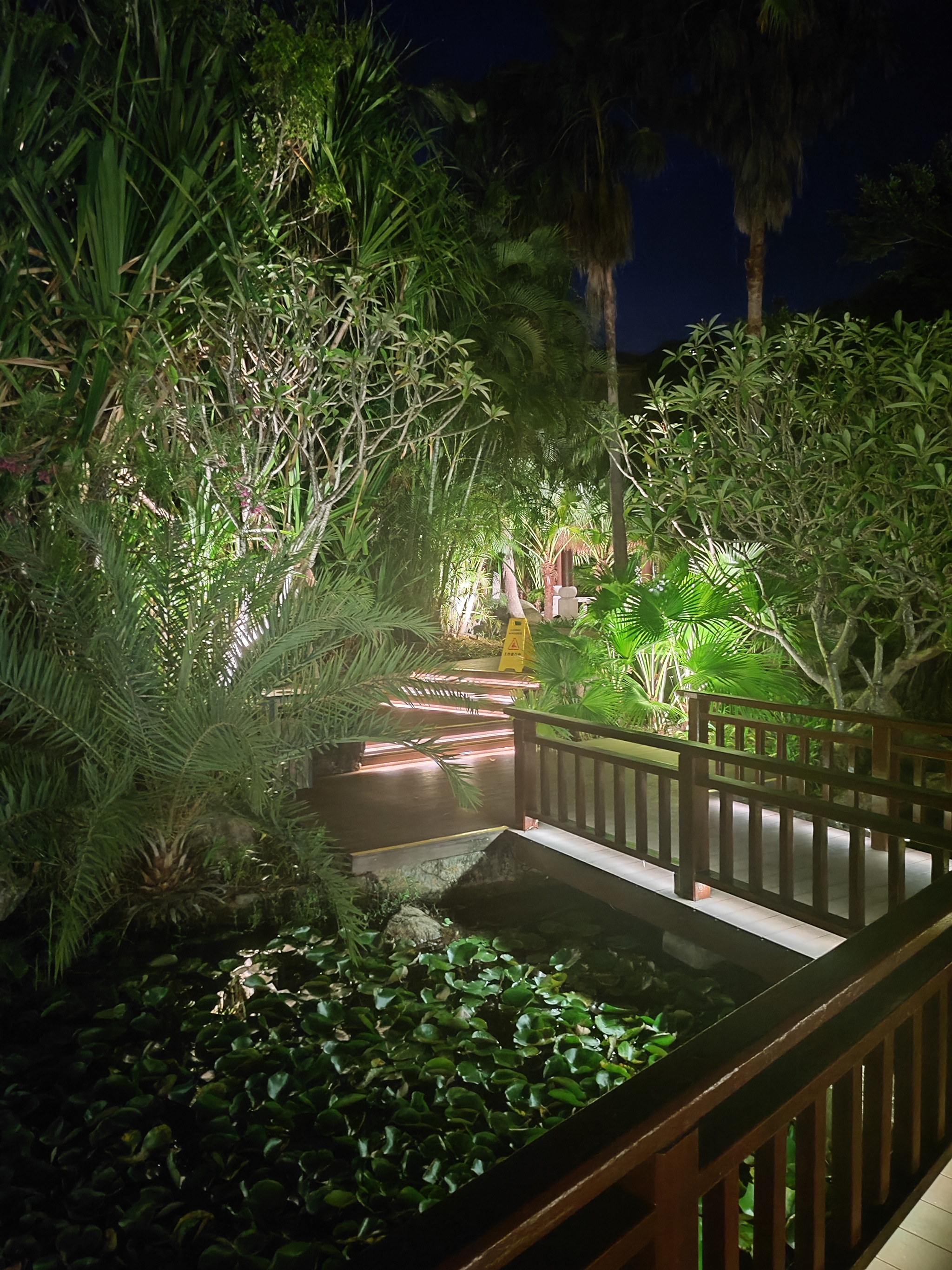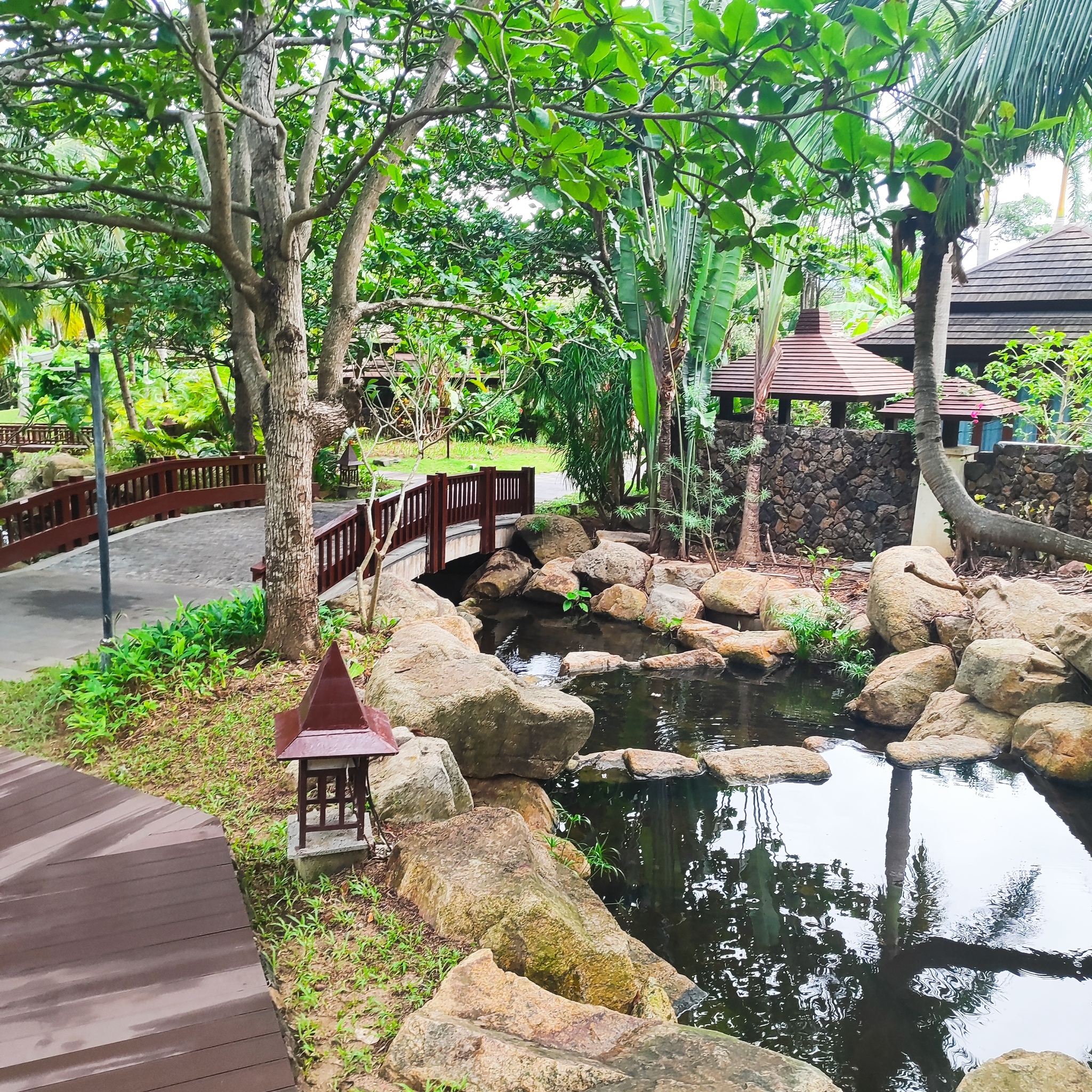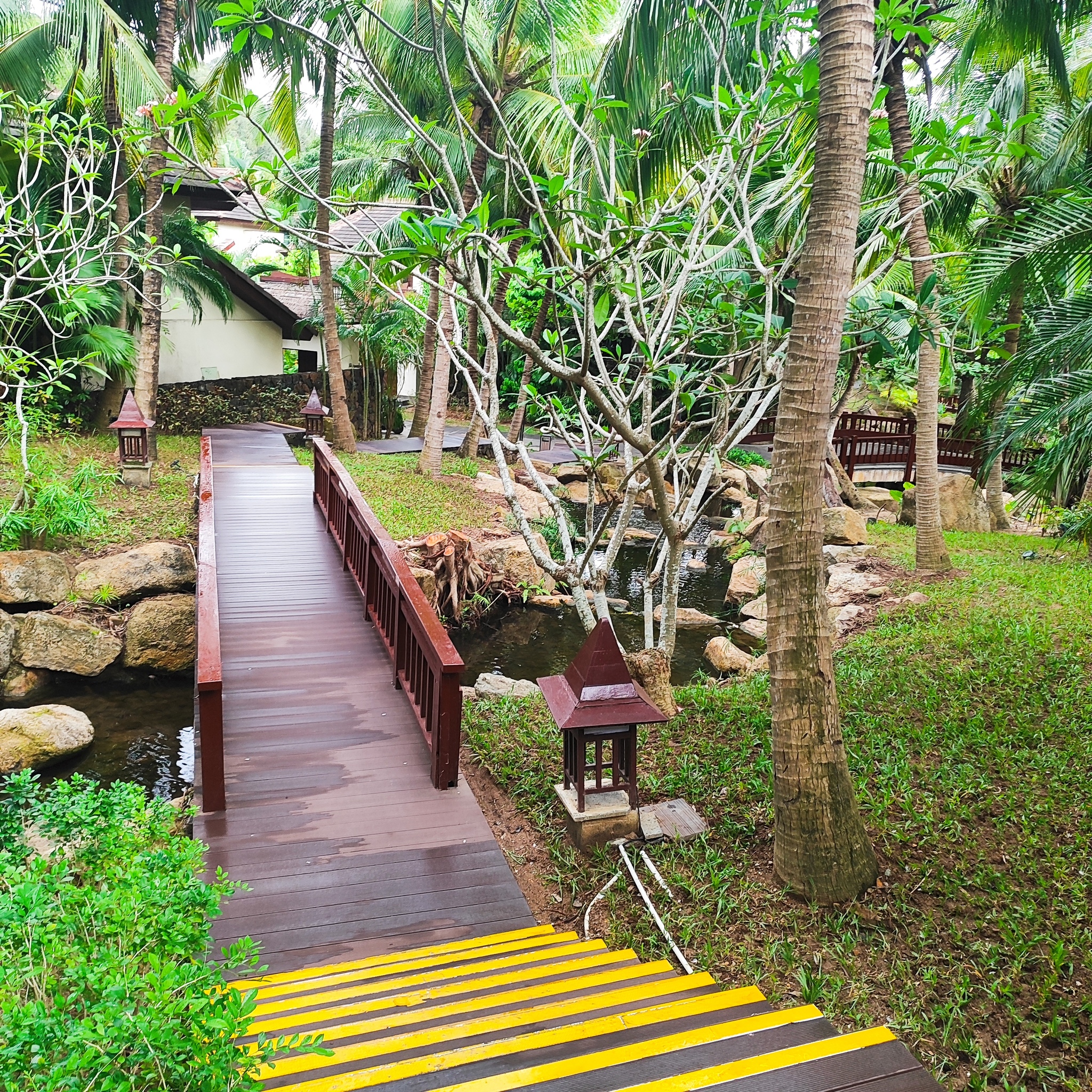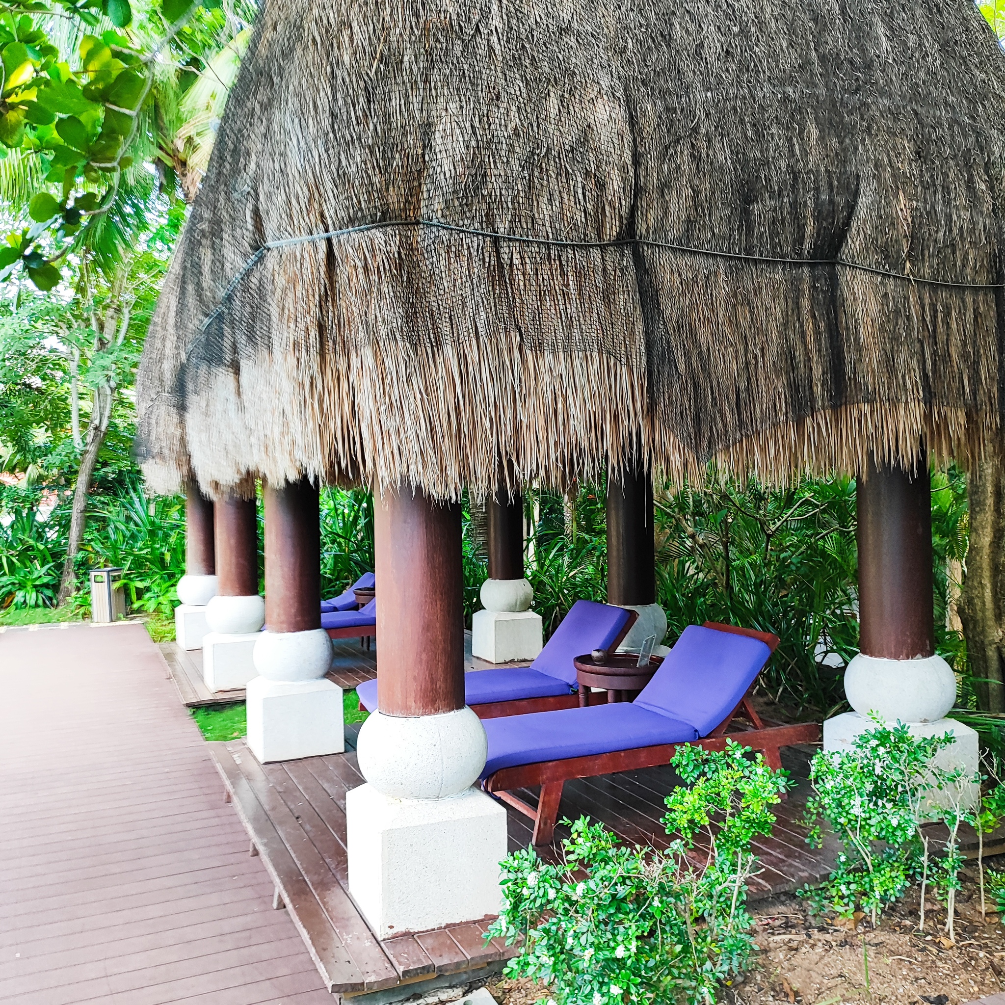 Отель 5 звёзд, большая территория у подножия горы, тропический сад, протекает ручей. На территории много вилл и в конце три девятиэтажных корпуса. Большой бассейн и детский бассейн. Ресторан. Номер большой и большой балкон. На балконе ванна. Оформление в балийском стиле, пол в гранитной плитке, стены в покраске, вся мебель из дерева, душ и туалет из матового стекла. Пластмассовые только розетки и выключатели, всё остальное натуральное экологичное. Балкон выходит в сад, поют птички, носятся белки. Если хотите вид на море, надо селится выше пятого этажа. Еда на завтрак китайская в основном, выбор очень большой. Привычная еда впрочем тоже есть - чай, кофе, молоко, йогурт, яичница, выпечка, пирожные, соки, фрукты, сосиски.