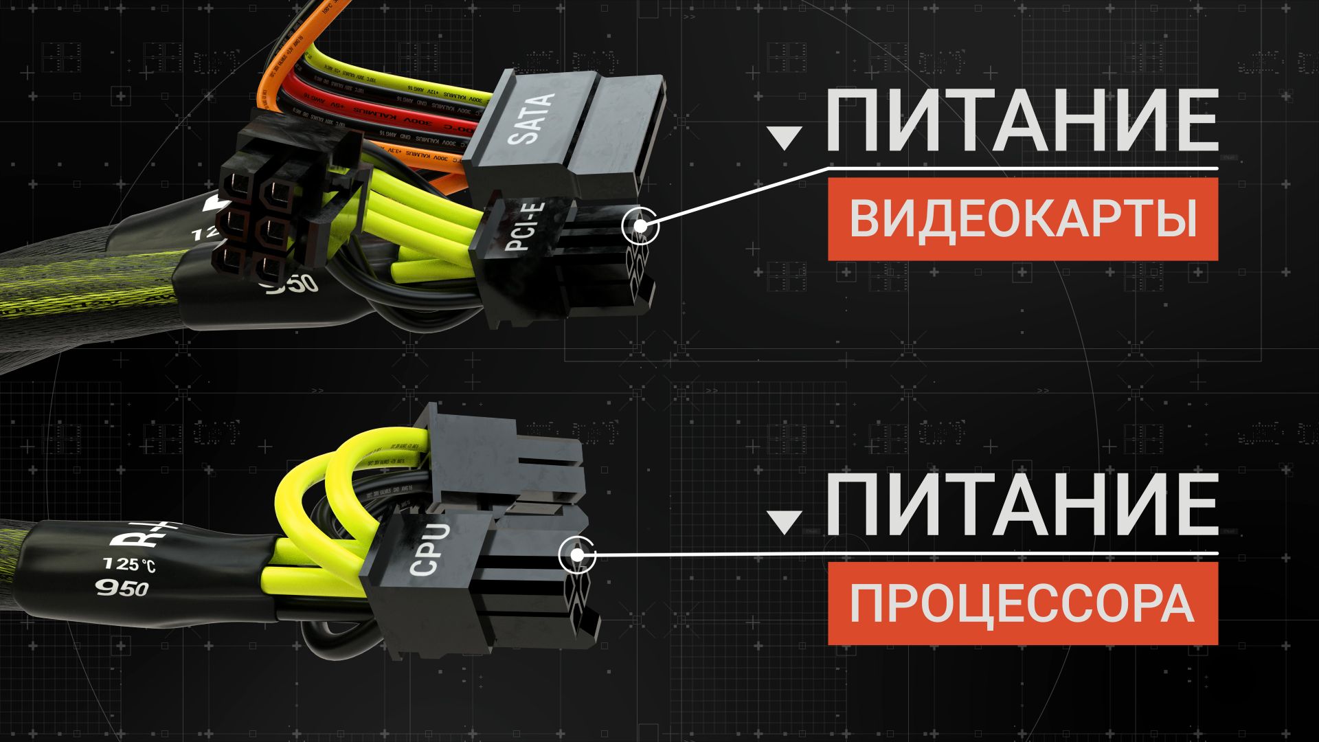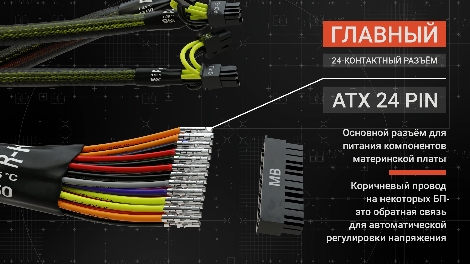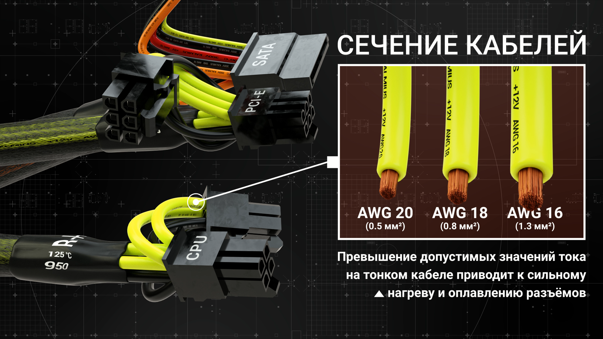 Обычно используют кабели с сечением — 0.5(20AWG) 0.8(18AWG) и 1.3 кв. мм(16AWG). Более толстые провода обладают меньшим сопротивлением, чем тонкие, поэтому меньше греются при увеличении силы тока, необходимой для нормальной работы видеокарт и процессора под нагрузкой.