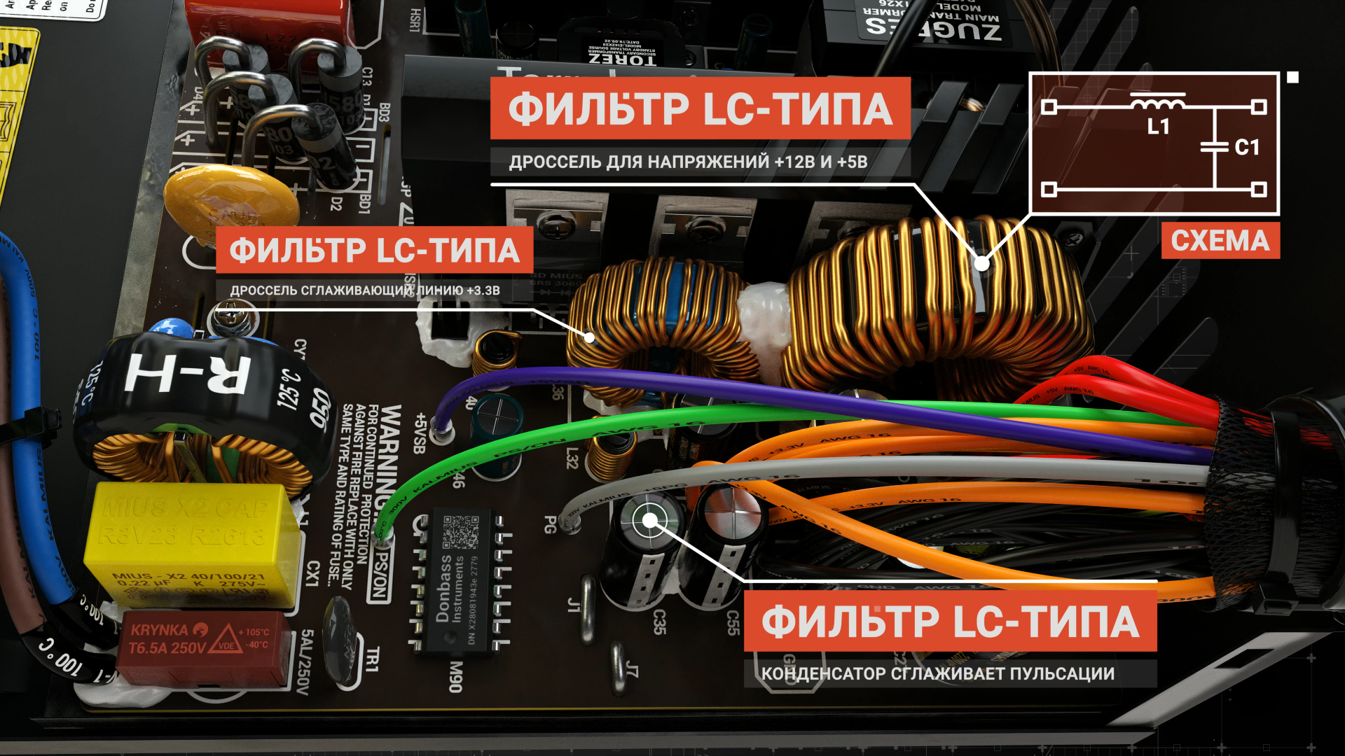 Обычно используют Г и П-образные LC-фильтры, так как сглаживаются высокочастотные импульсы, то большая мощность конденсаторов и катушек не нужна. Для напряжений 12В и 5В используют дроссель групповой стабилизации. 3,3 вольтовая линия стабилизируется отдельно, дросселем поменьше. Связанный дроссель, на несколько линий ставят для экономии места и уменьшения скачков напряжения при резком изменении нагрузки.