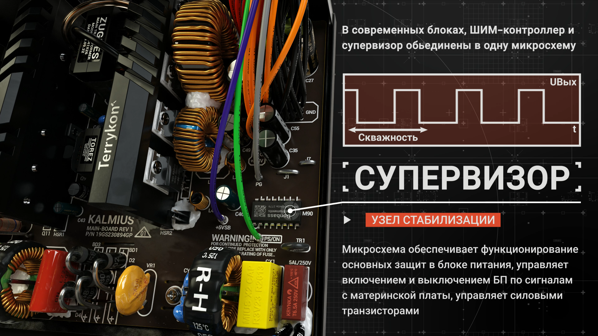 В современных БП супервизор и ШИМ-контроллер объединены в одну микросхему. Она следит за величиной выходных напряжений. Если напряжение слишком низкое, микросхема увеличивает ширину импульсов (Скважность), пропуская больше мощности через трансформатор и увеличивая напряжение на вторичной обмотке БП. Если хотя бы одно из напряжений выйдет за допустимые пределы, то отключится сигнал Power Good, тем самым материнская плата экстренно остановит систему.