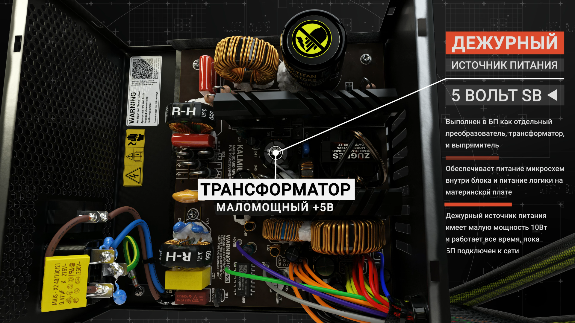 Даже когда компьютер «выключен», 5В источник дежурного питания обеспечивает работу: часов реального времени, функции пробуждения, а также подает питание на порты USB.