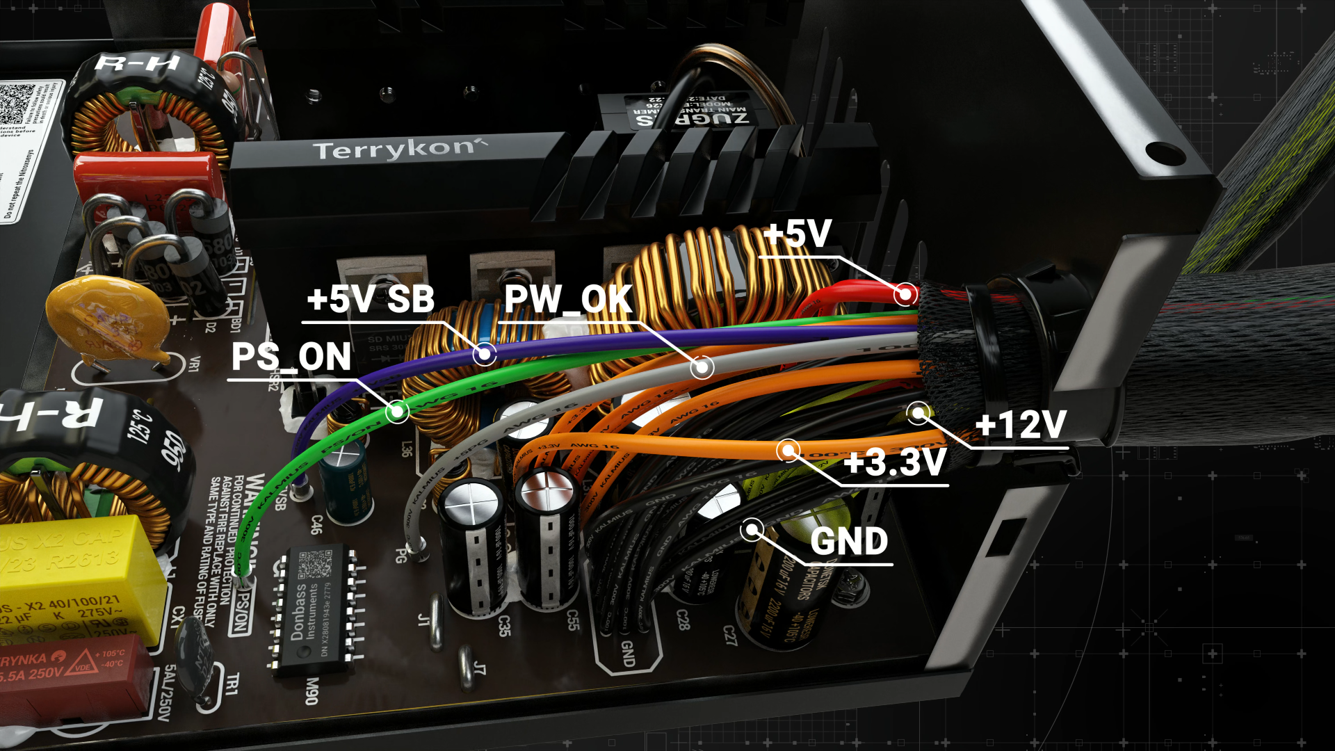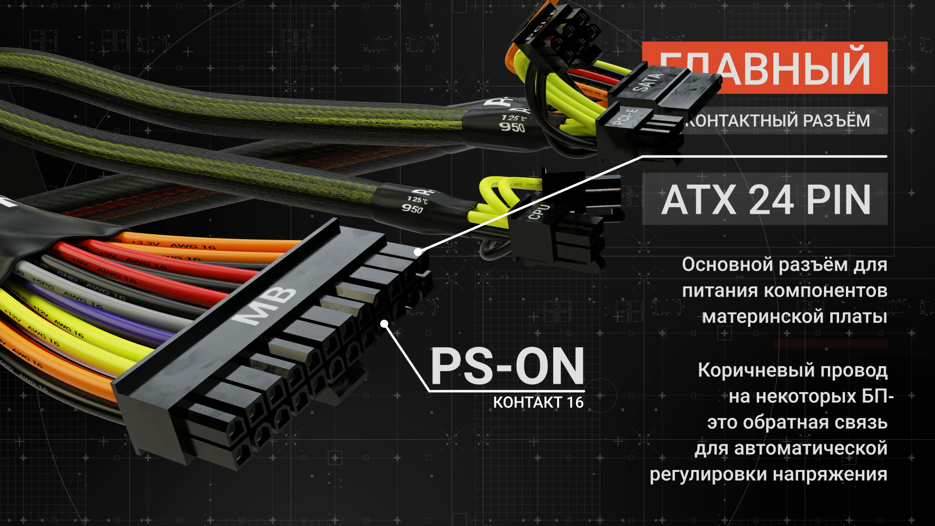 Сигнал что питание в норме(PW_OK, Power Good), через серый. Через зелёный провод отправляется сигнал включения (PS_ON, Power On). Черный — это общий провод, «земля».