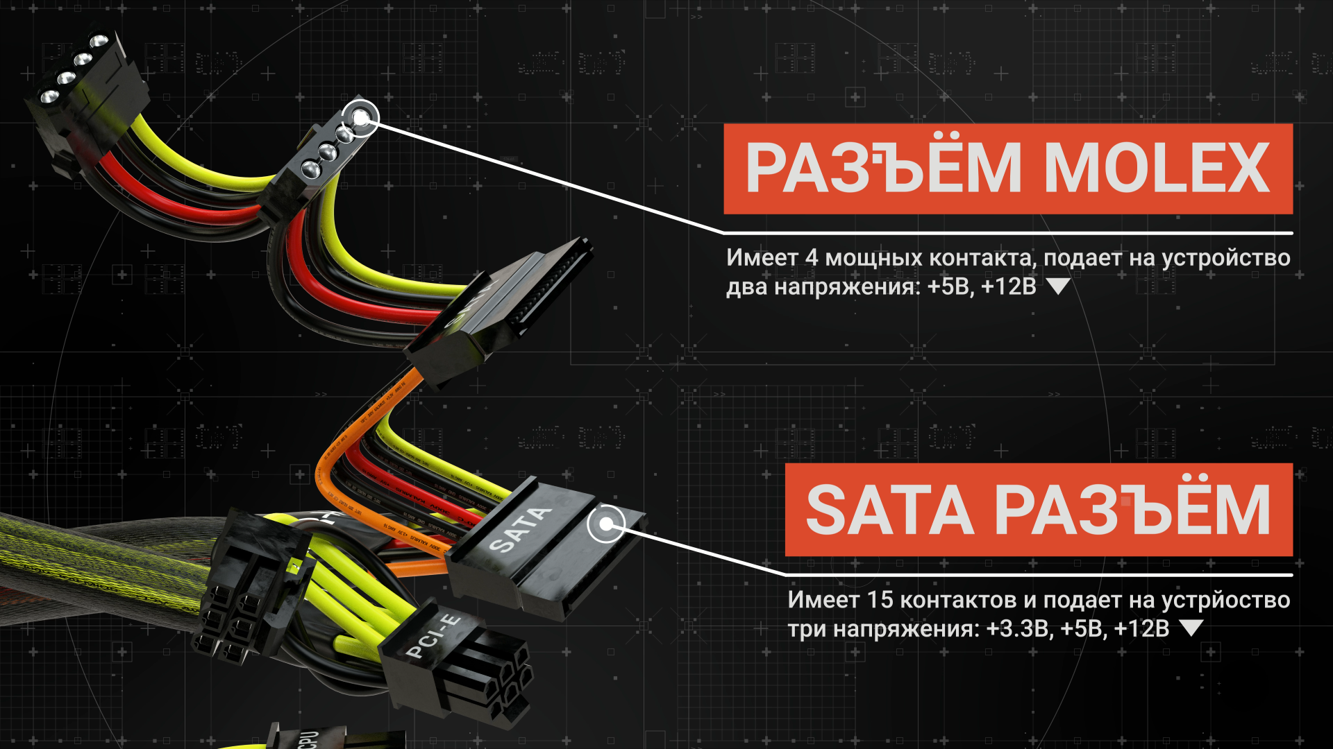 Накопители, приводы и прочие маломощные устройства питаются отдельно, от разъёмов SATA и MOLEX.