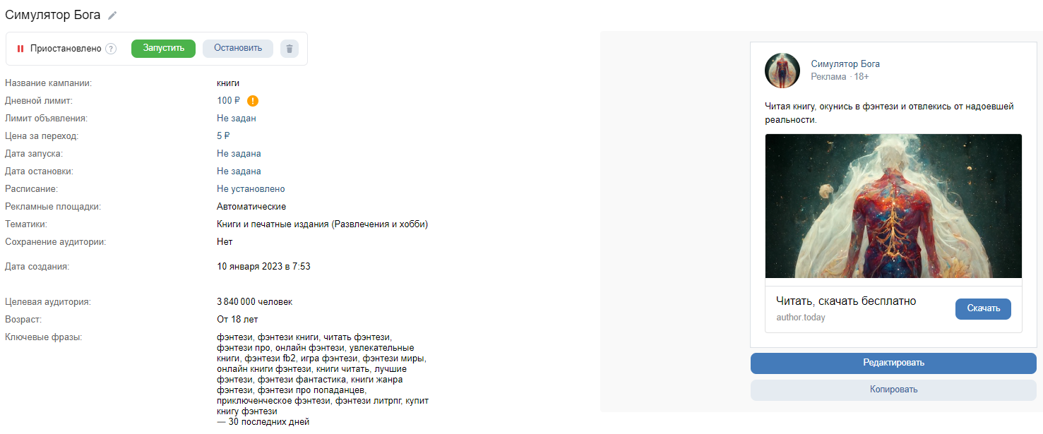 Было создано аналогичное объявление с такими же условиями. Книга была загружена Authortoday и 10 января я по той же схеме запустил с ценой за клин 2 рубля. Результат, как вы видите тот же самый.