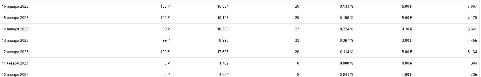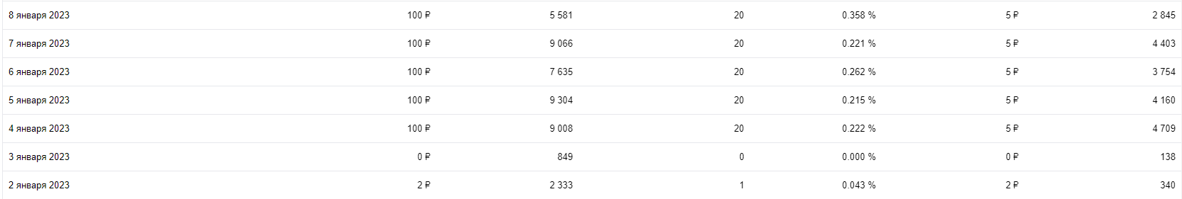 Сначала я попробовал запустил объявление указав стоимость 2 рубля, но как видите за сутки объявление было показано 2333 раза и только 1 клик. Достаточно мало и подумав денек я решил попробовать увеличить стоимость до 5 рублей за клик. С 4 января как мы видим дневной бюджет в размере 100 рублей начал расходоваться полностью. Кликов выходило 20 штук на 9000 показов.