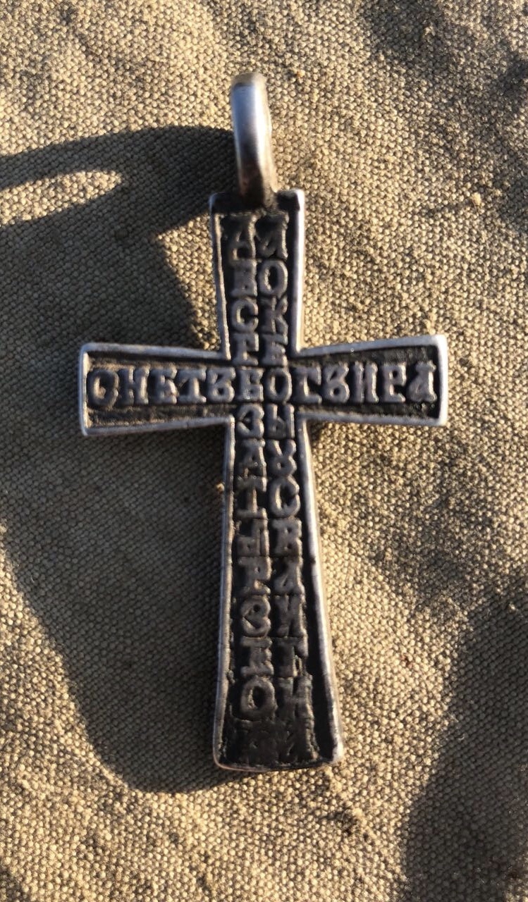 К сожалению из интересных серебряных монет больше ничего не было. Но и эти находки – уже большая удача. Следующей достойной серебряной находкой стал внушительных размеров нательный крест. При том глубина залегания его была не более 10-15 см от поверхности. 84 царская проба, год изготовления 1884.