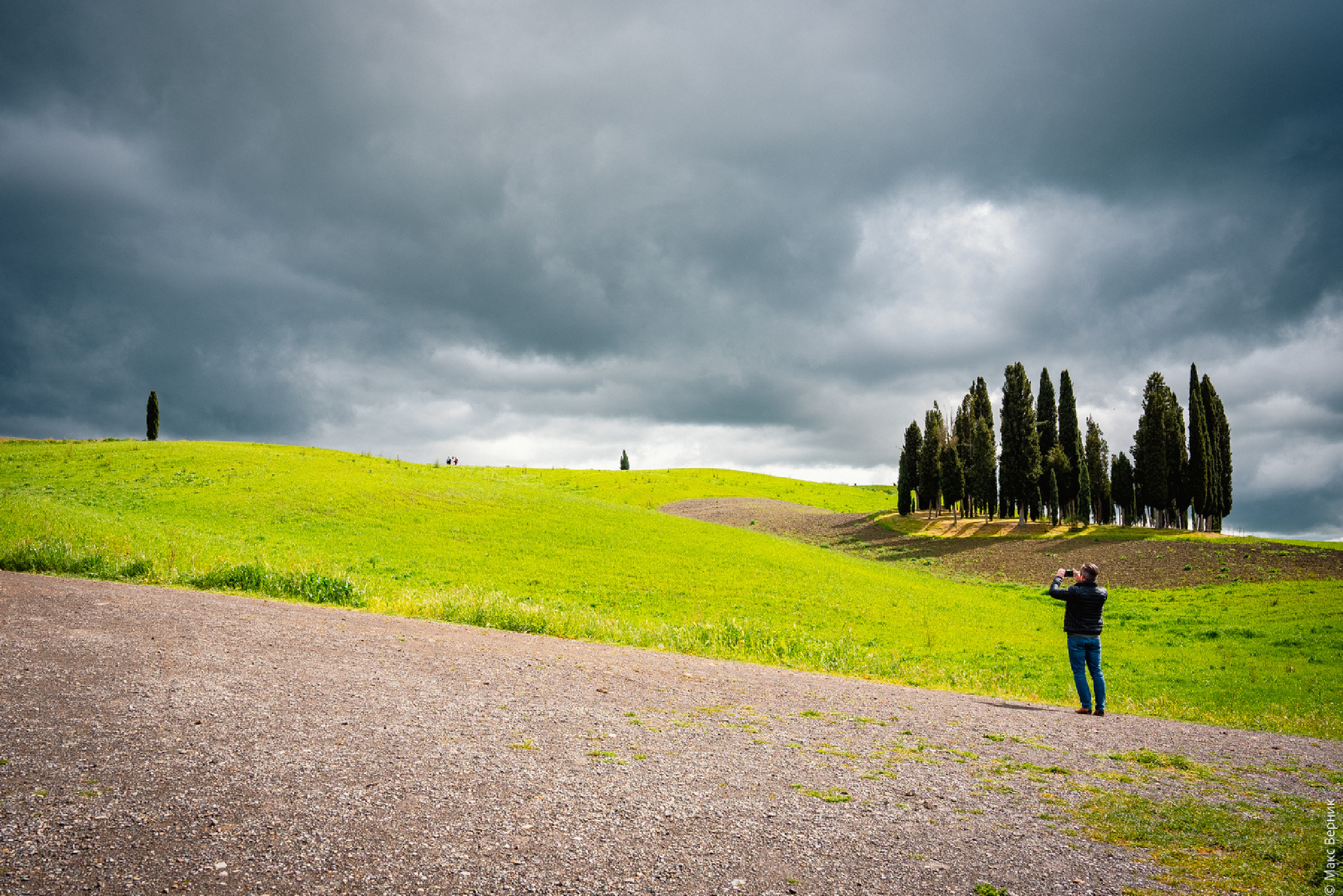 В итоге я вернулся в машину, всё высушил, переждал дождь и щёлкнул очередную точку, вот то одинокое, стоящее слева, дерево на холме – как говорилось во всех путеводителях – одно из самых фотографируемых мест Тосканы.