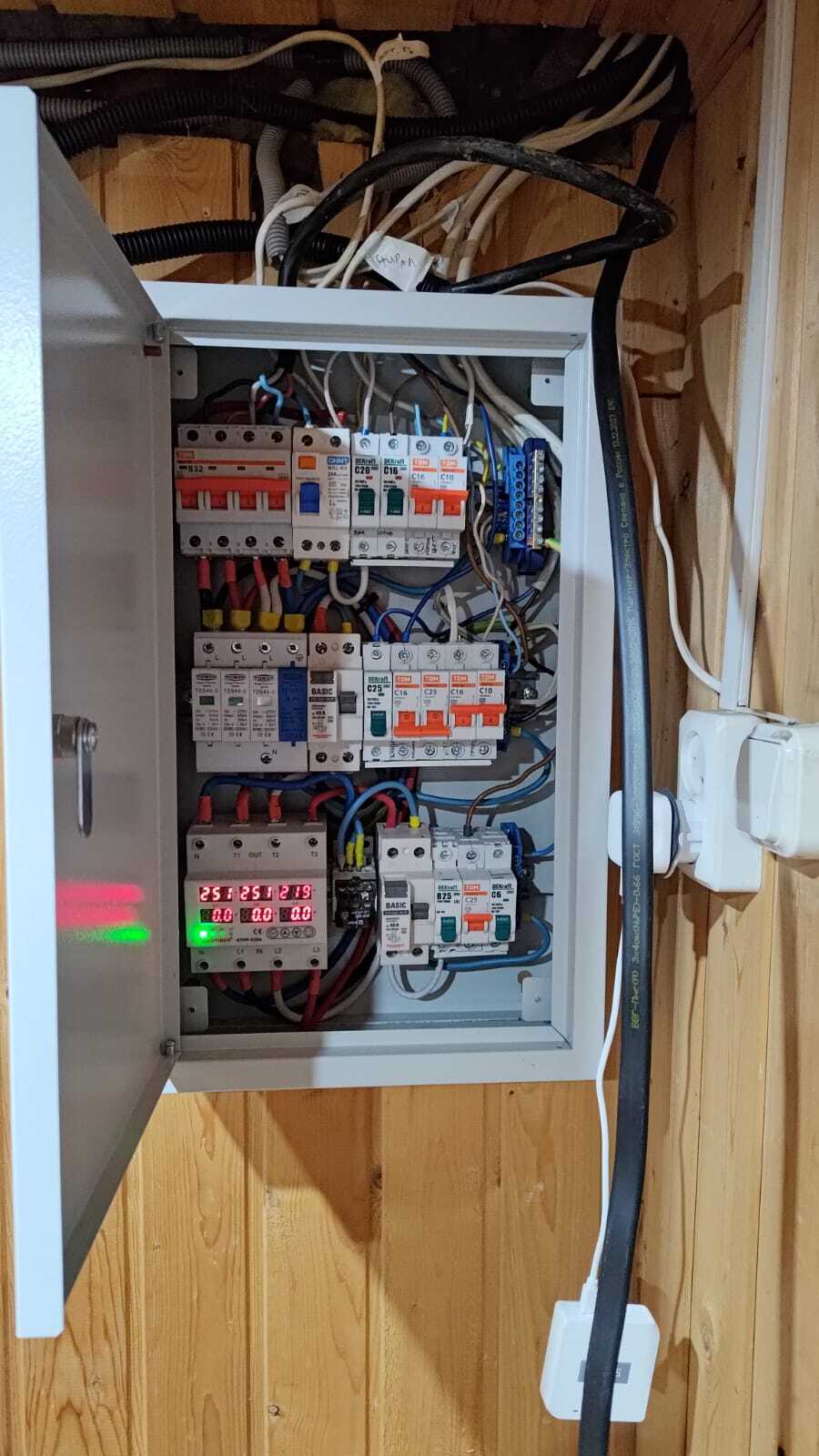 Заходят три фазы, идут вдоль левой части щитка - в верхнем ряду слева - общий автомат ввода, средний ряд слева - защита от удара молнии в провода, требует подключения "земли", это позже. "Земли" в доме нет совсем.