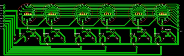 Скачал Sprint layout, взял уже существующие платы и начал переделывать под свой проект. Чтобы как-то украсить часы, решил использовать в качестве подсветки трёхцветный светодиод с общим катодом и с четырьмя выводами. Их расположение было строго определено под лампами, из-за этого пришлось сделать двухстороннюю плату.