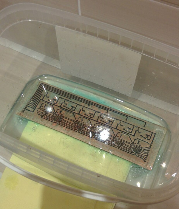 Платы делал с помощью технологии ЛУТ (лазерно-утюжная технология подробно можно почитать в интернете). Не было особого опыта в этом деле, так что первая двухсторонняя плата получилась с 3-4 раза, использовал глянцевую бумагу плотностью 100-110. Очень хорошо отваливается после переноса. Травил платы в растворе: