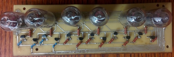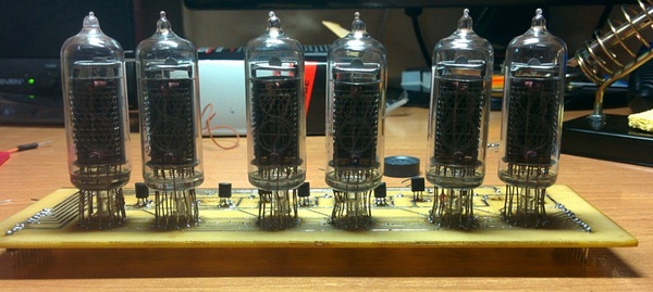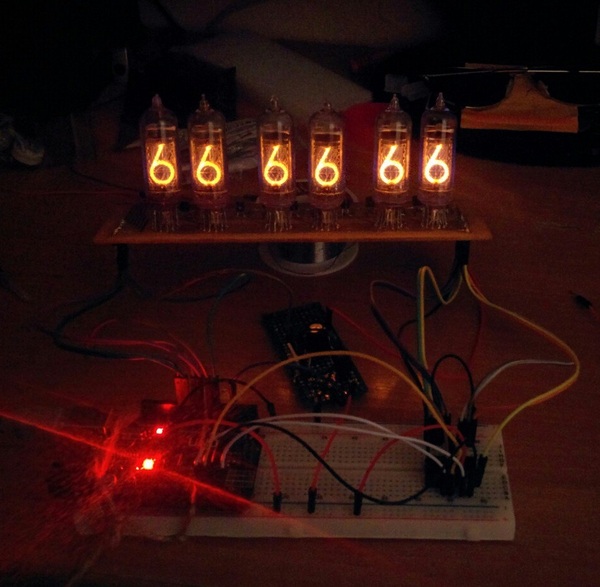 Собрав блок питания, начал подключать лампы - сначала по одной, чтобы проверить их работоспособность. После чего - через высоковольтный дешифратор к155ид1. В этот промежуток времени была убита arduino nano, чем я был опечален (случайно что-то замкнул на макетке, симптомы: arduino при подключение по юсби atmega начинало сильно греться, через секунд 10 невозможно было держать палец; всегда горел LedPin).