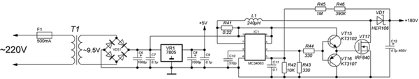 К тому времени, как я закончил с платой (это растянулось на пару месяцев), пришли arduino nano. Для того, чтобы зажечь лампу ИН-14, необходимо 150-180 Вольт, причем оптимальное значение - это 160-170В, и чем больше вольтаж, тем ярче горят. Необходимо преобразовывать 5-9 вольт в 160-170В. На хабре нашел вот такую схему.