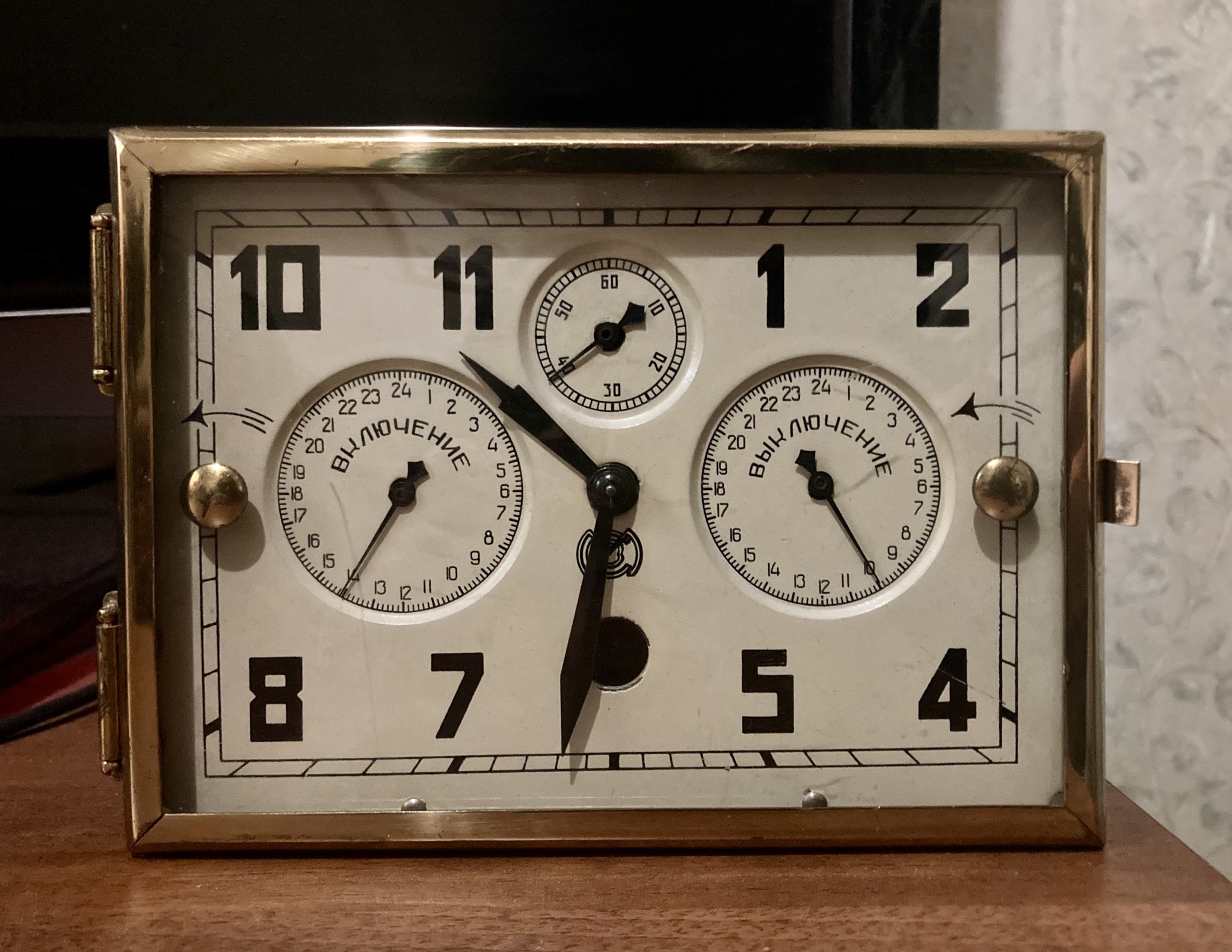 Теперь давайте посмотрим внимательнее на циферблат часов. Что ещё интересного мы увидим? Во-первых, секундная стрелка у него вынесена отдельно (находится вверху). Для примера, настольные советские часы с такой компоновкой циферблата встречаются довольно редко. А, во-вторых, мы видим, что и цифры, и стрелки имеют интересный ретро-стиль.