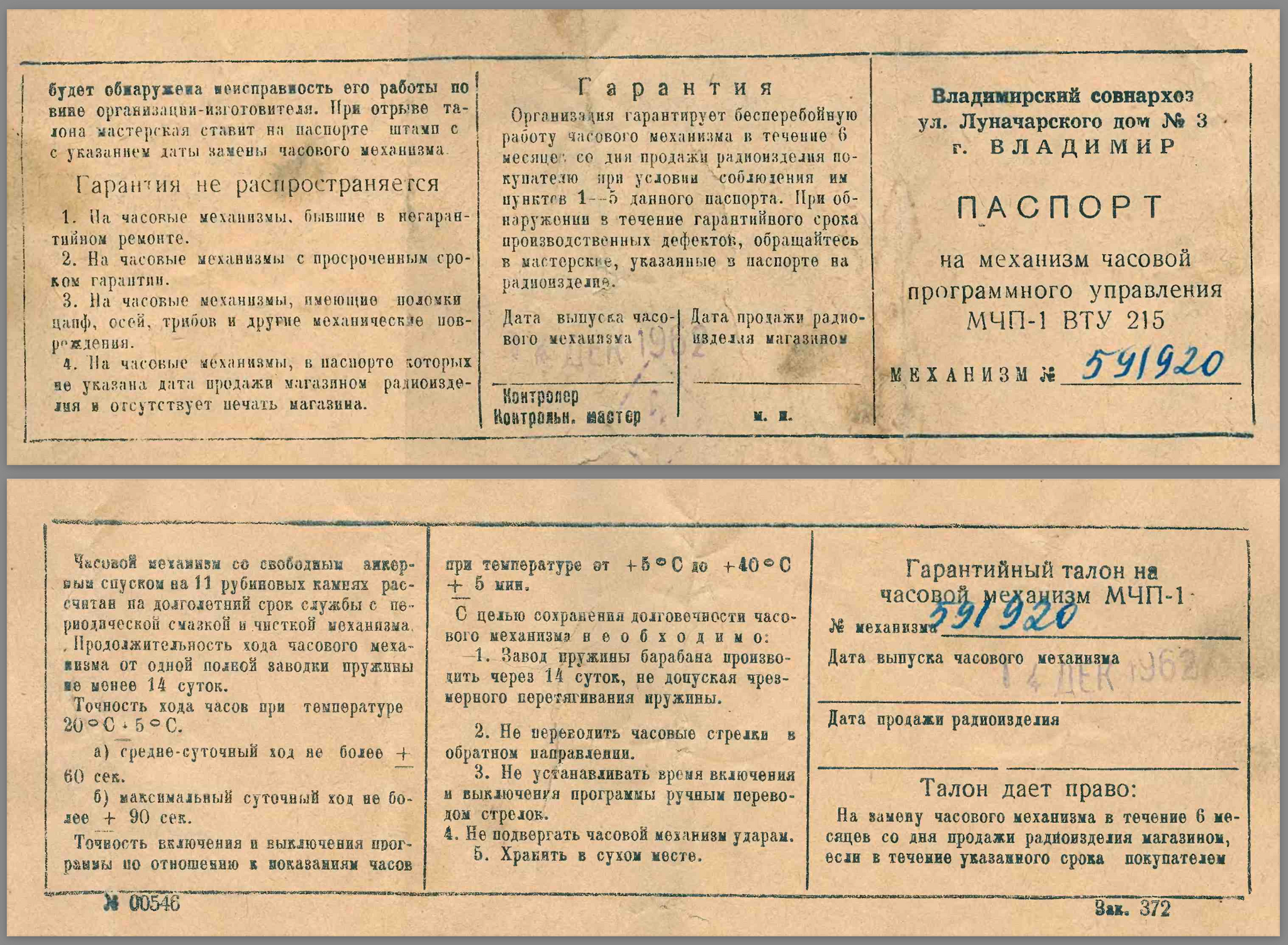 Но мы же сейчас рассматриваем не саму радиолу, а её часы. А у часов, вернее у их механизма, был свой отдельный паспорт! И вот, как он выглядел: