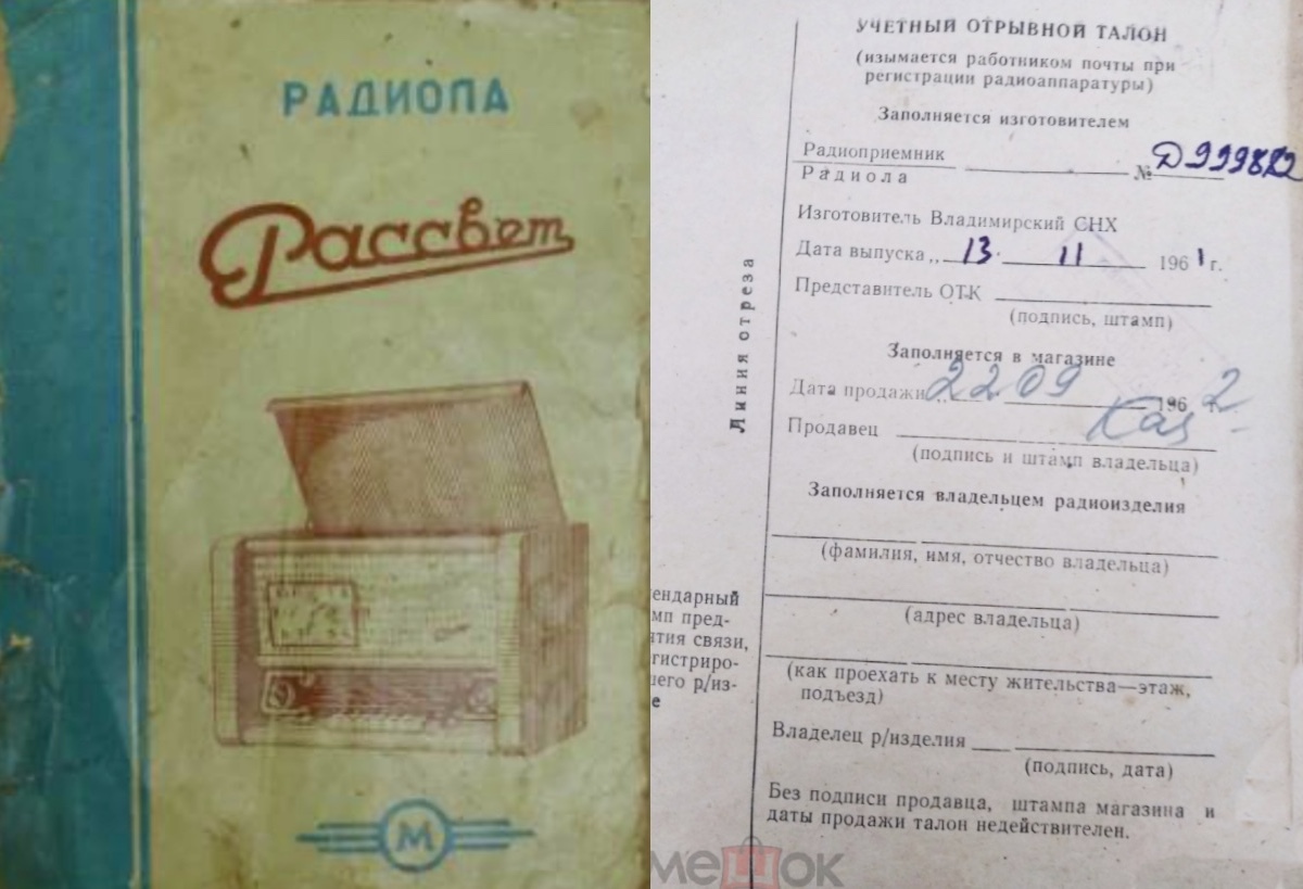 «ВКЛЮЧАЕТСЯ АВТОМАТИЧЕСКИ. Вы пришли с работы и хотите немного отдохнуть. Но через полтора часа должна начаться интересная радиопередача, которую вам очень хочется послушать. Как быть? Выход нашли работники предприятия Владимирского совнархоза, дав "путёвку в жизнь" приёмнику и радиоле "Рассвет". Они снабжены часовым механизмом для автоматического включения и выключения в заданное время. Цена приёмника 965 рублей, радиолы — 1165 рублей».