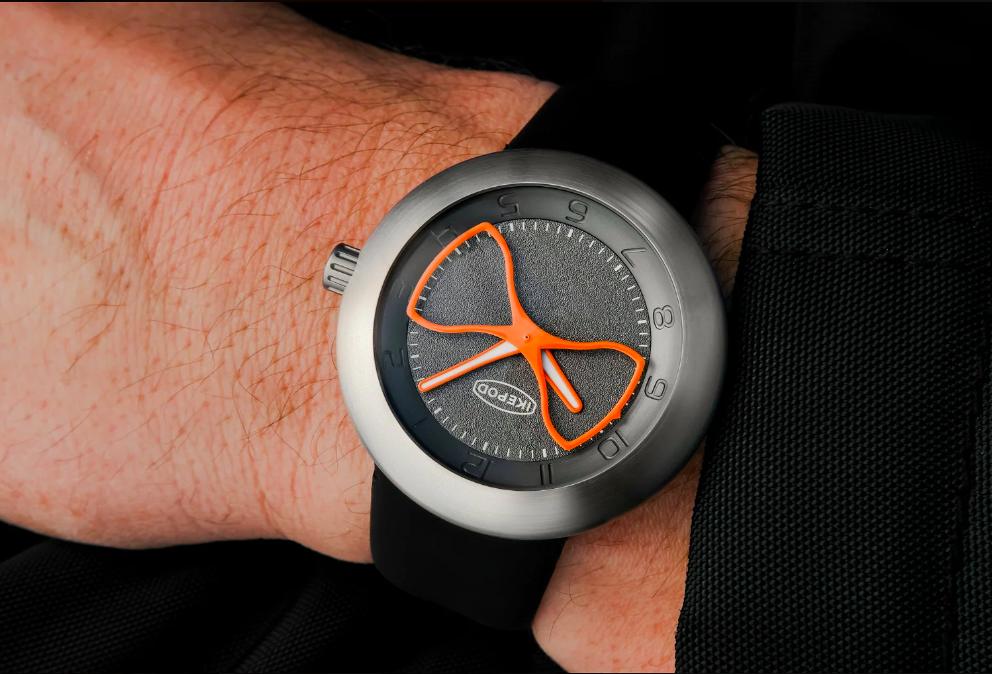 Это часы марки Ikepod - с интересными циферблатами. На верхнем фото модель, секундная стрелка которой сделана в форме песочных часов. Нужно еще привыкнуть к быстрому движению такого заметного элемента на циферблате. Но смотрится здорово.