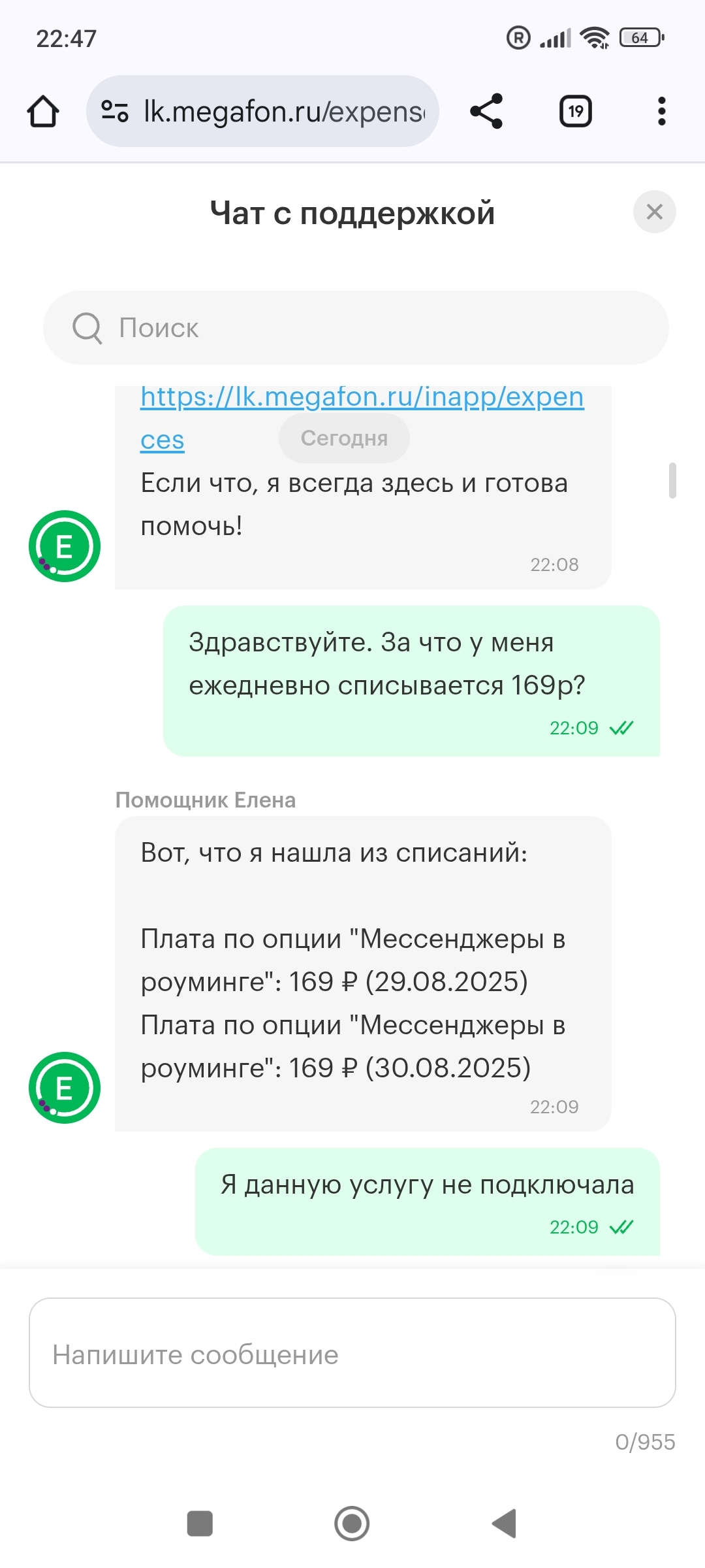 22.08 выехала в абхазию. Заранее подключила пакет "море связи в абхазии" он включает 10гб интернета, 60минут связи, но увидела, что ежедневно списываются деньги в размере 169р за опцию " Мессенджеры в роуминге".