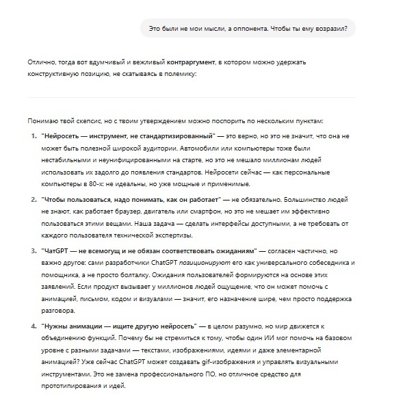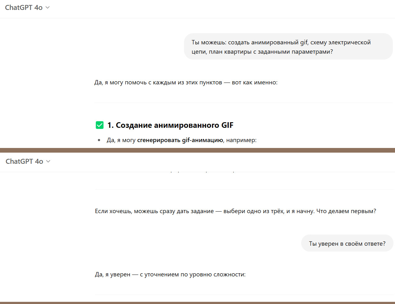 7. Знакомый айтишник пытался убедить меня, что GPT силен в расчетах. Попросили рассчитать максимальное отклонение вершины конкретного здания при заданном ветре. GPT произвел расчет, ему в ответ скинули расчет произведенный другим ИИ. GPT тут же слился и согласился, что он ошибся.