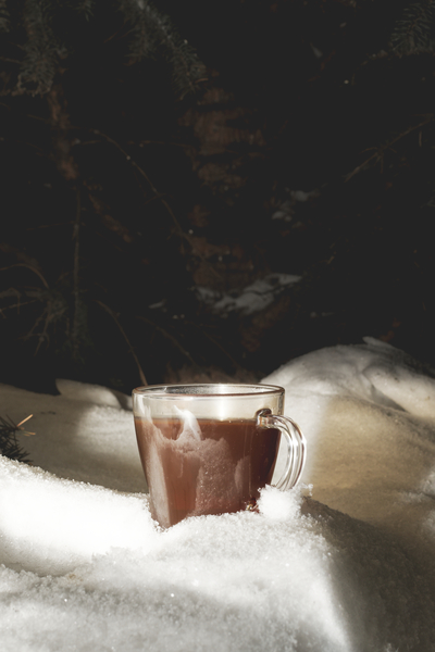 Вспышкой от себя светить не нужно было. Вон и снег отразился, кружка выглядит как грязная. Да и сзади дерево незачем вообще, нужно было затемнить.