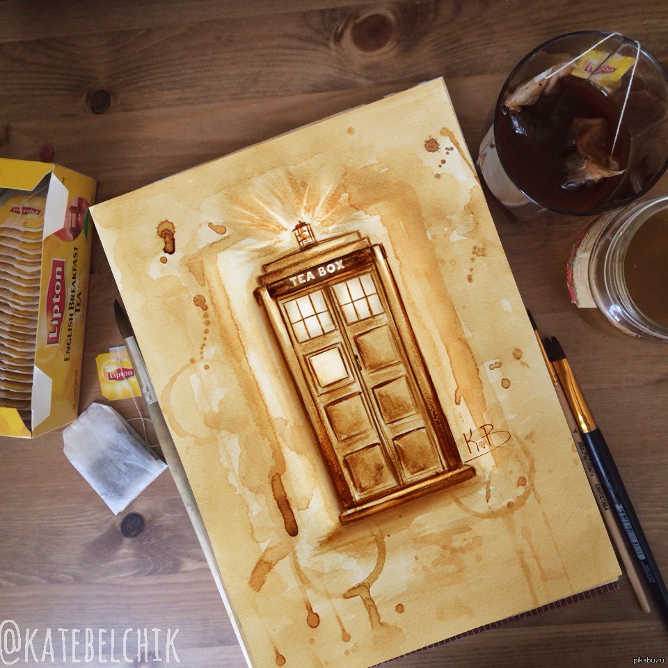 739 katebelchik Чайная тардис 10 лет назад Мой арт по доктору. Вместо красок использовала крепкий настой чая:) [моё] Доктор Кто ТАРДИС Арт Рисунок Художник Чай