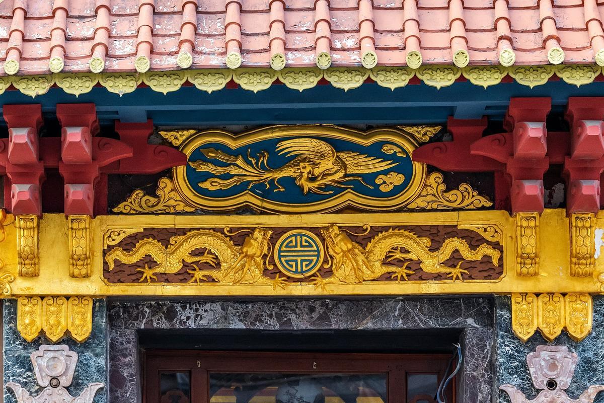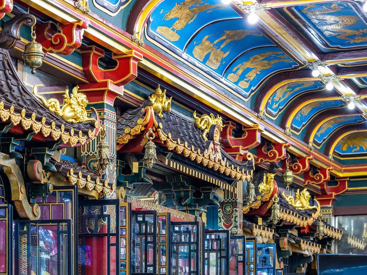 Китайская стилизация присутствует и в интерьере магазина: расписные плафоны, традиционное сочетание цветов – синего и красного с золотом, – изображения обязательных драконов, птиц, бамбука, цветущей вишни. Интерьер был дополнен предметами, привезенными из самого Китая: огромными вазами, скульптурой, фонариками, на полу был разложен громадный ковер.