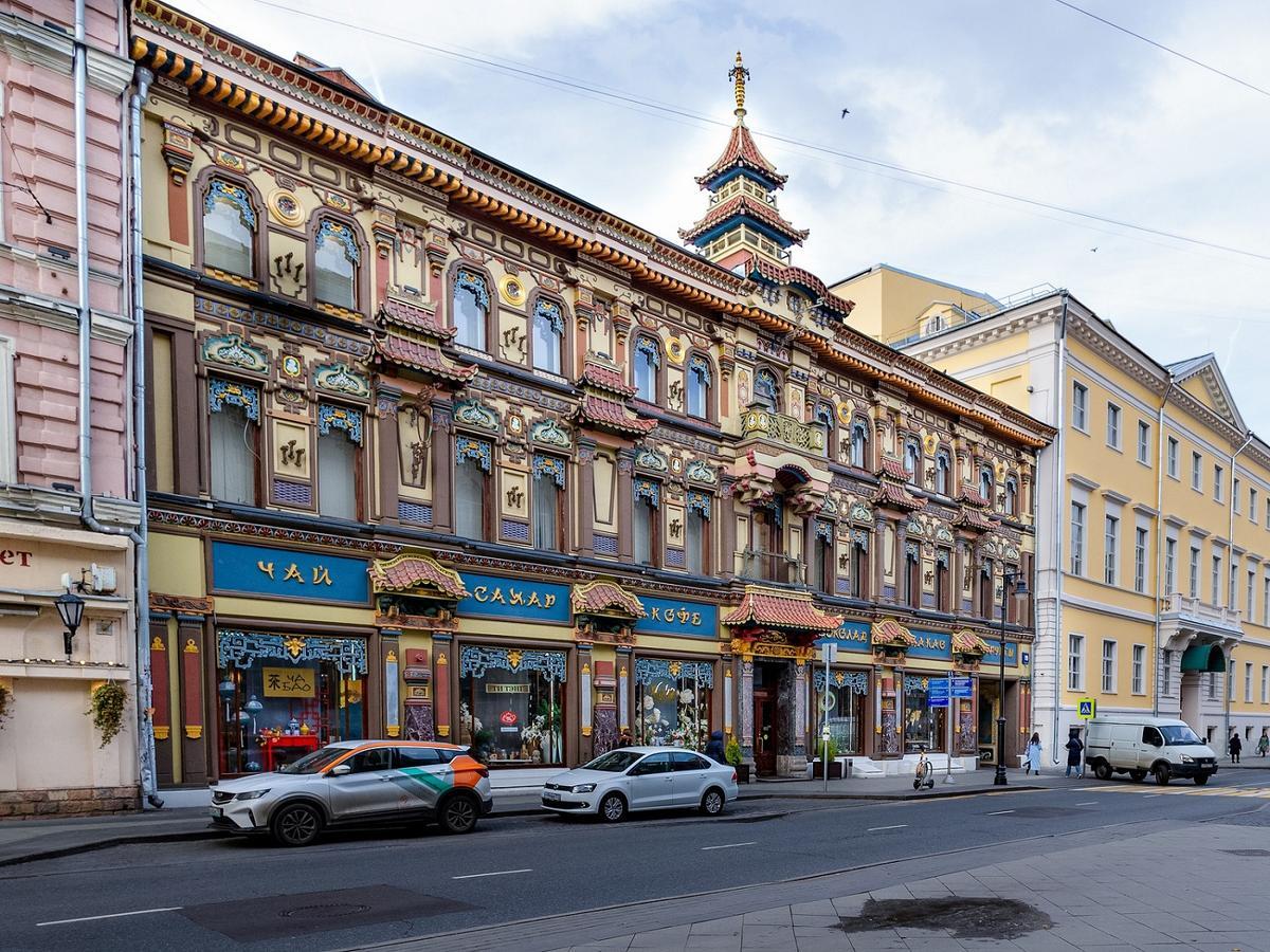 Сергей Васильевич Перлов, тот, который с Мясницкой, решил заманить гостя видом привычного для него, как он полагал, дома. Само трехэтажное здание было построено за три года до этого архитектором Р. Клейном. Другому архитектору, К. Гиппиусу, за короткое время удалось создать это чудо с китайским орнаментом, резьбой и башенкой–пагодой на крыше.