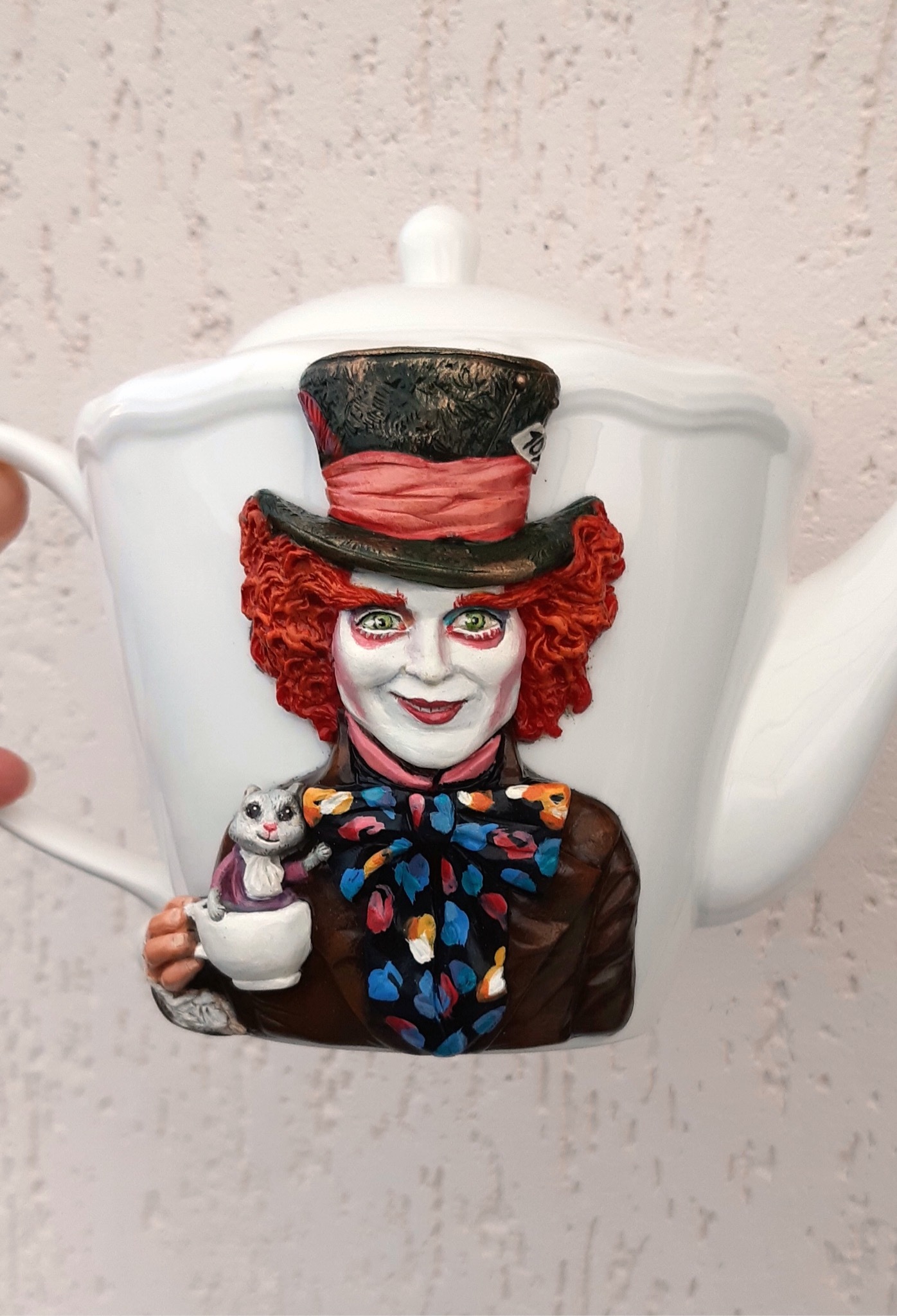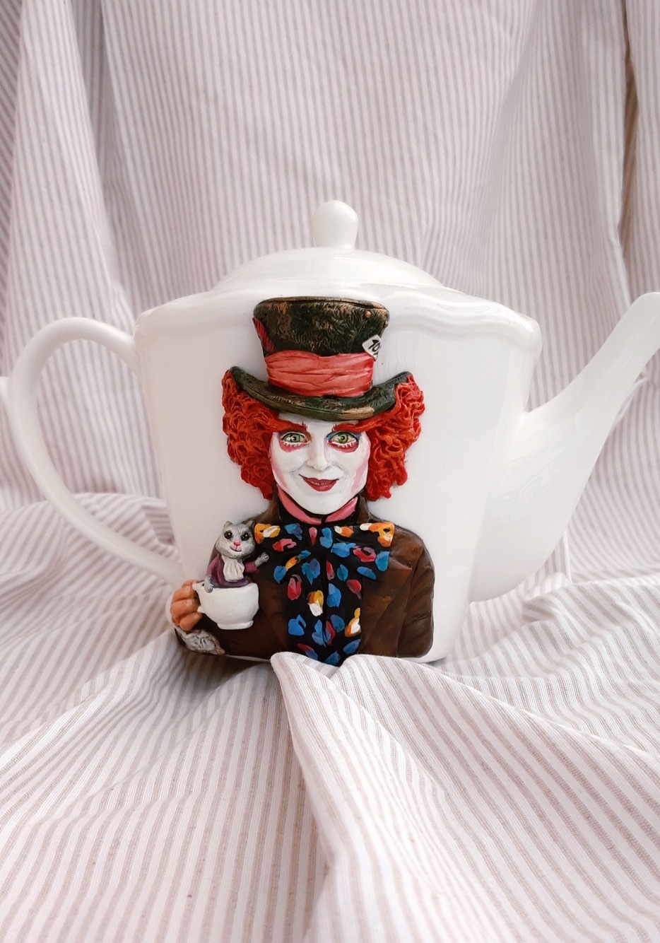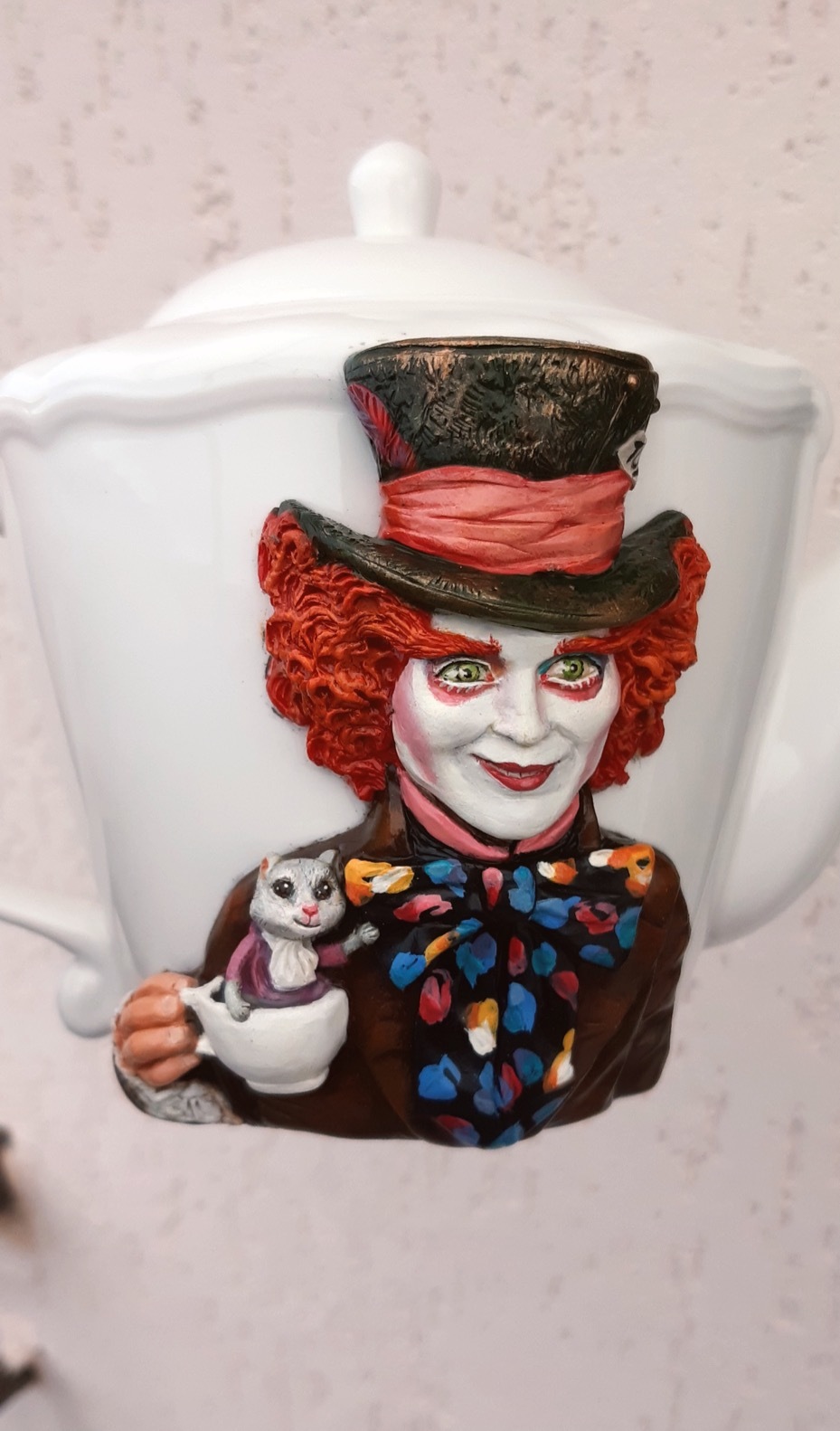 Но вот одна из недавних задумок в процессе ее реализации - целый сервиз по мотивам Алисы в Стране Чудес) Кружки с Чеширом и Мартовским зайцем были сделаны на повтор, пост с перезагрузкой кошары выложу следом, а сейчас на повестке чайник со Шляпником!