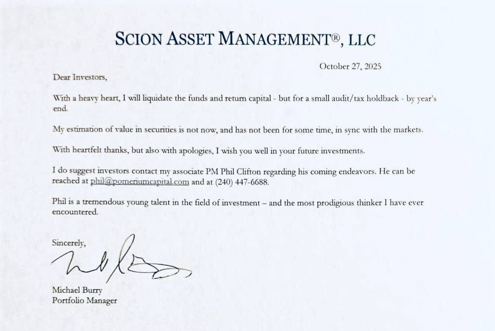 🐌 Майкл Бьюрри, главный герой фильма «The Big Short», отозвал регистрацию своего фонда Scion Asset Management в SEC. Дескать, «мои оценки стоимости ценных бумаг уже давно не совпадают с оценкой рынков – я умываю лапки!». Пишут, что скорее всего Майкл будет дальше рулить своим фондом как чисто семейным офисом, без внешнего капитала.
