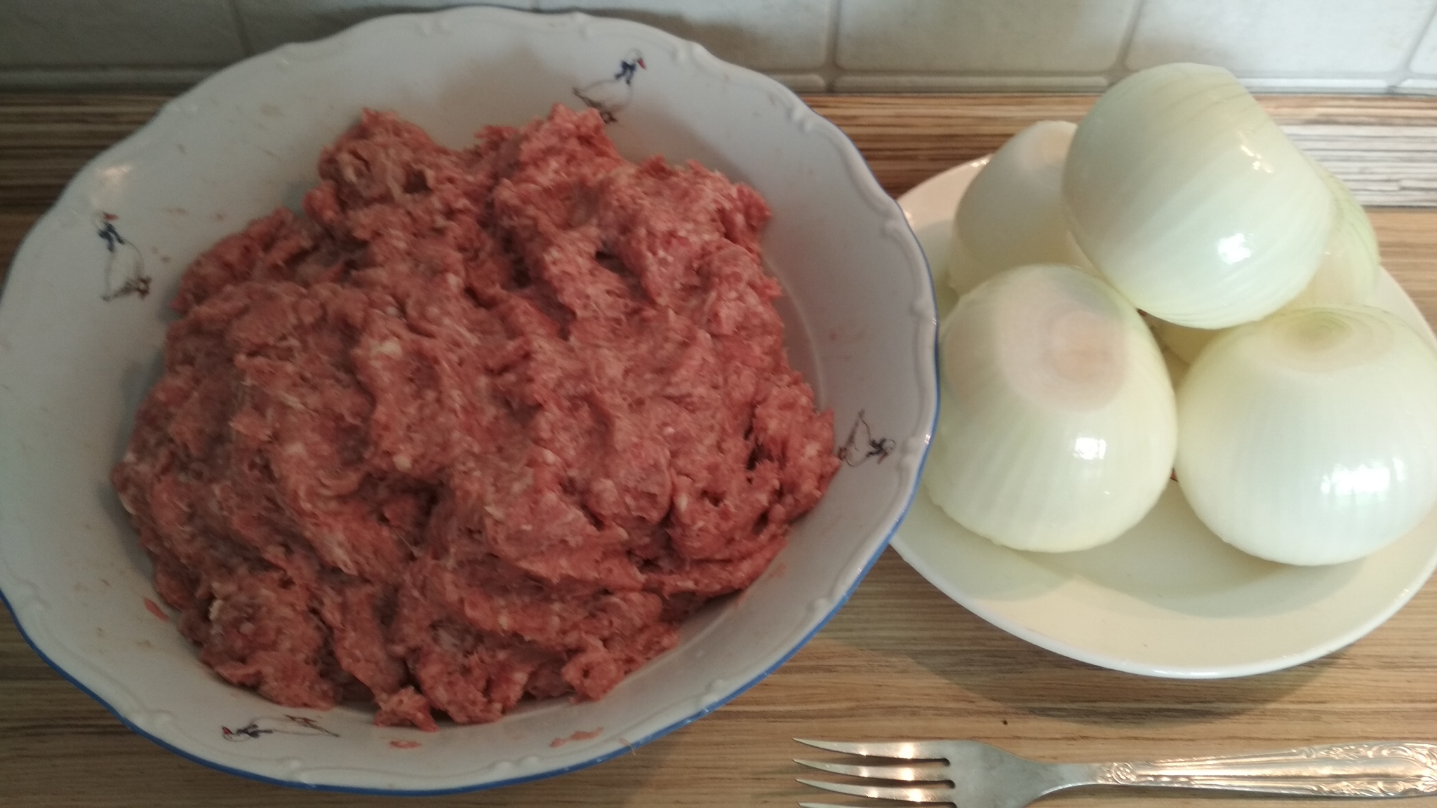 В первый раз, я действительно, положил в фарш мало лука, и плеснул водички. Я исправил это. На фото виден объем лука в соотношении к объему фарша. Один к одному или даже один к 1,2.