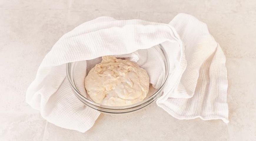 Добавьте к тесту оставшуюся часть муки и вымешивайте 10 мин. – тесто начнет отлипать от рук. Скатайте тесто в шар и заверните в пищевую пленку, оставьте на 30 мин.