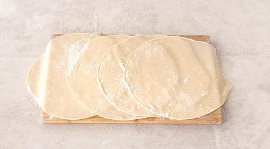 Раскатайте тесто в пласт толщиной 2 мм. Вырежьте круги диаметром 12–14 см (удобно использовать блюдце как трафарет).