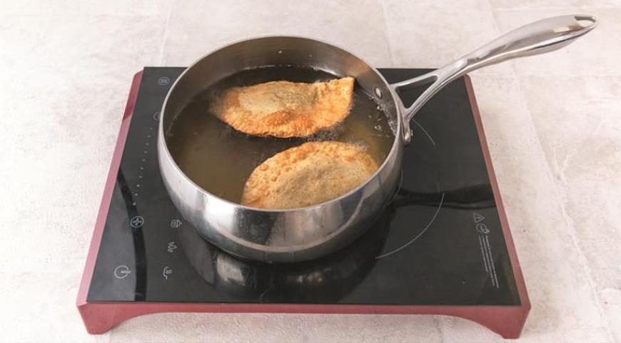 В глубокую сковороду налейте растительное масло слоем 4 см и поставьте на средний огонь. Температура масла должна достигнуть 180 °С, на это потребуется 10–15 мин. Осторожно опускайте по 1–2 чебурека в кипящее масло. Когда чебуреки зажарятся с одной стороны, переверните на другую. Затем переверните снова и жарьте еще 1 мин.