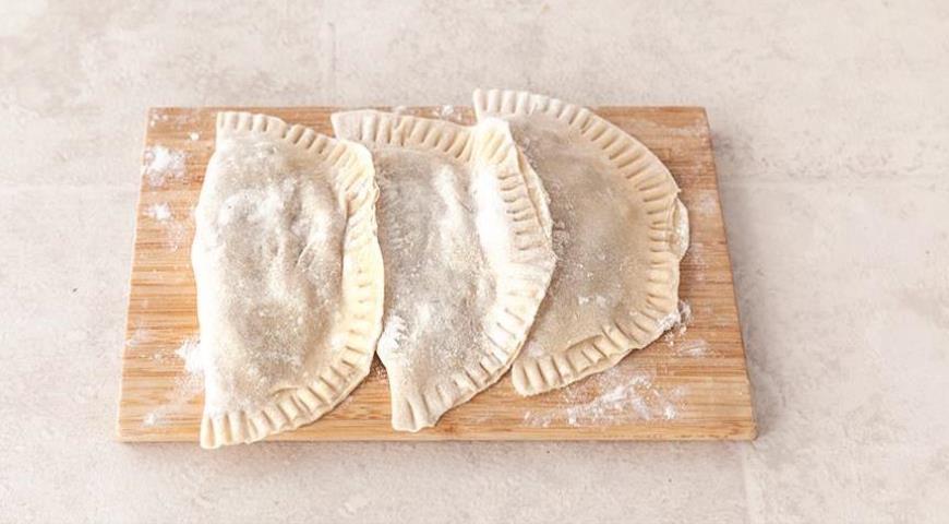 На одну половину круга положите фарш и разровняйте, не доходя до края на 1 см. Накройте фарш второй половиной теста. Прижмите края при помощи вилки.