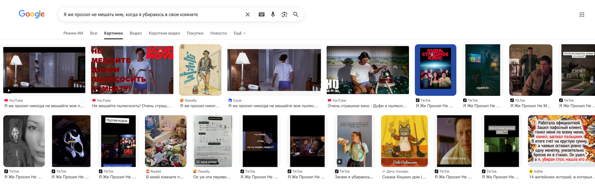 Запостил вчера пост просто поржать, и поделился с другом. Вспомнили сразу фильм. Полез искать фото. Фразу писал по памяти, может она и не на 100% совпадает с оригиналом. Я же просил не мешать мне, когда я убираюсь в свое комнате Что отсылает к фильму Очень страшное кино. Классика пошлых комедий. Итоги: