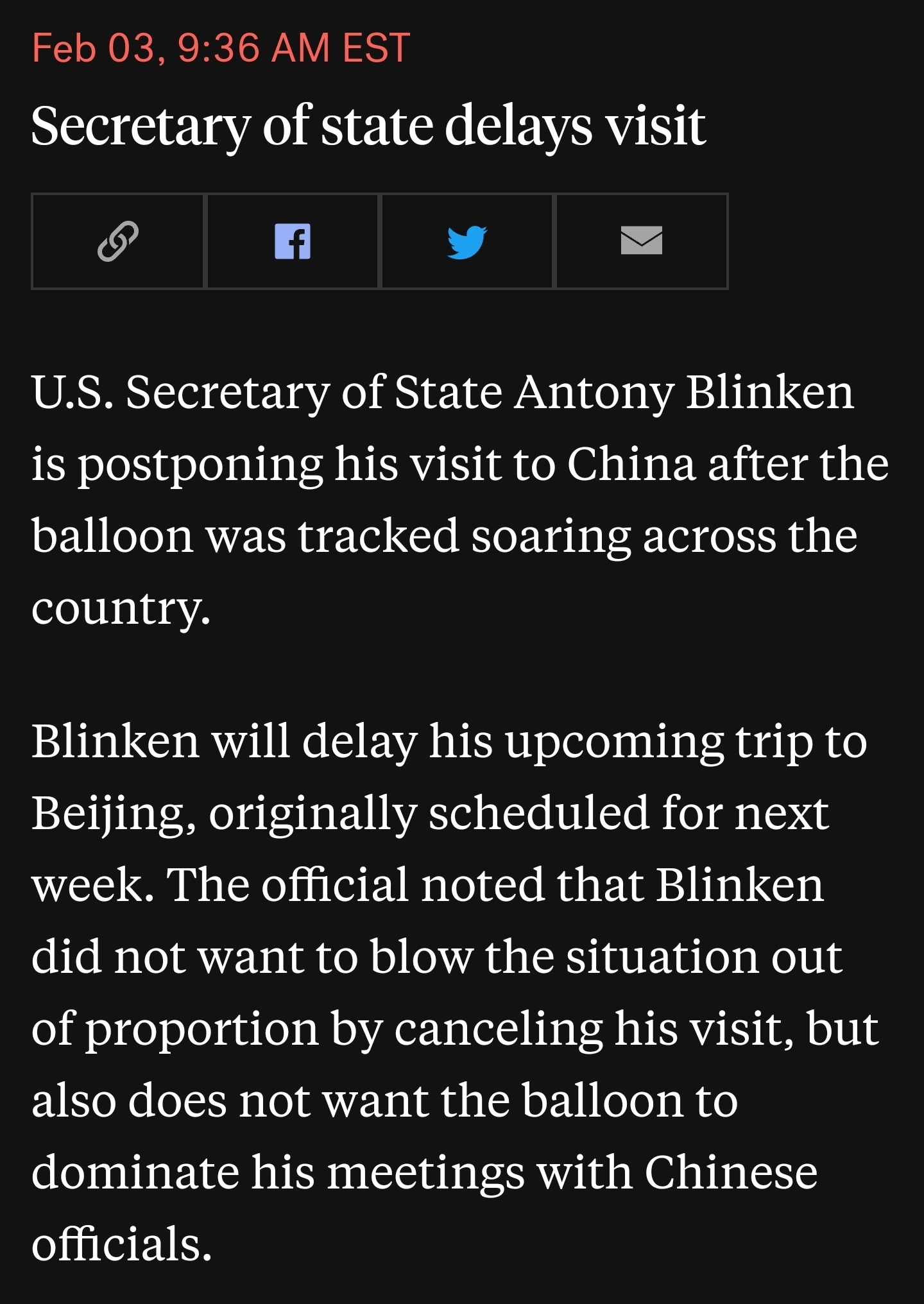 Госсекретарь США Энтони Блинкен отложил свой визит в Китай после того, как воздушный шар пролетел над страной. Блинкен отложит свою предстоящую поездку в Пекин, первоначально запланированную на следующую неделю. Чиновник отметил, что Блинкен не хотел раздувать ситуацию, отменив свой визит, но также не хочет, чтобы воздушный шар доминировал на его встречах с китайскими официальными лицами.