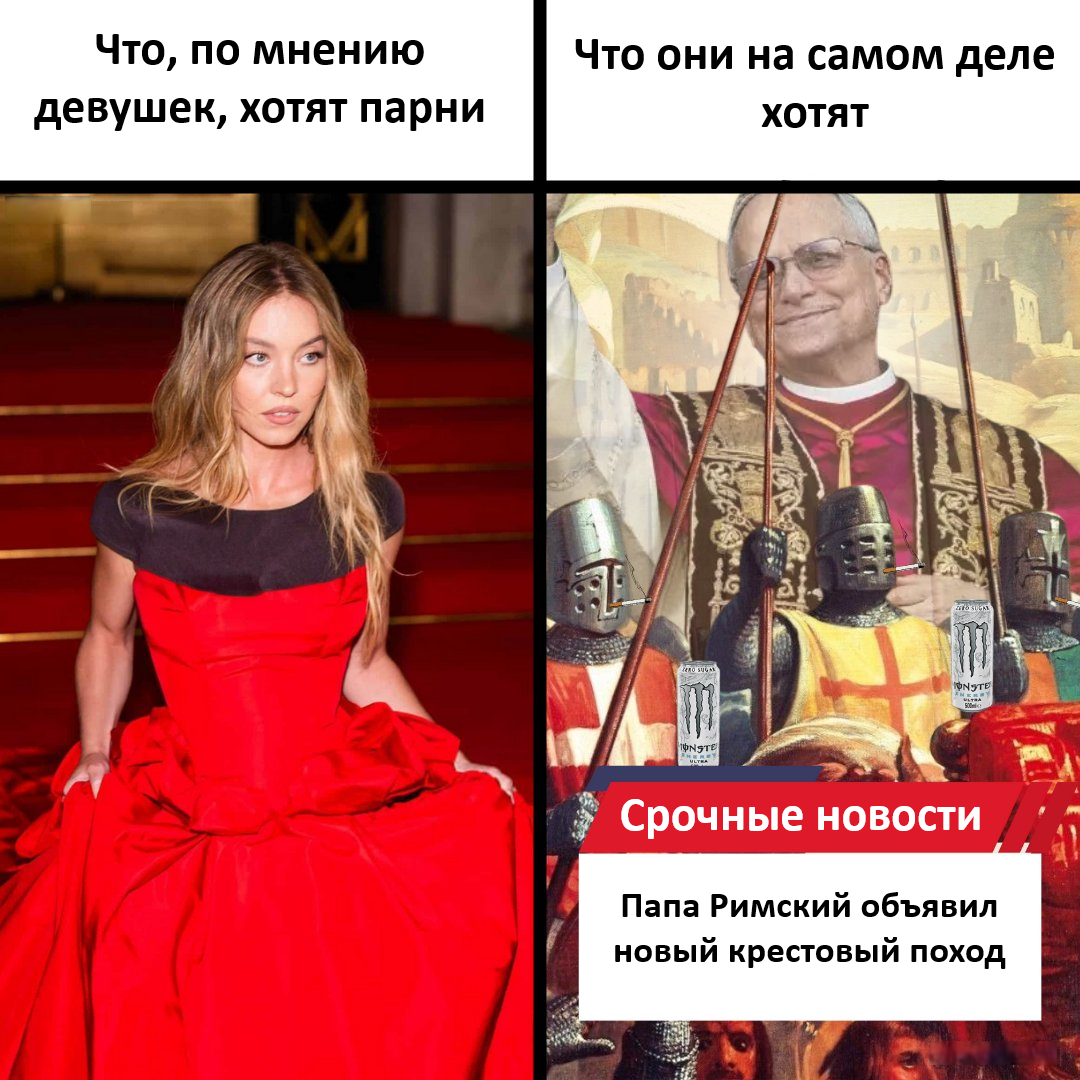 38 WakeUppNeo 27 дней назад Юмор для всех и каждого Чего хотят парни Юмор Картинка с текстом Сидни Суини Крестовый поход Папа Римский 4 Ещё 0