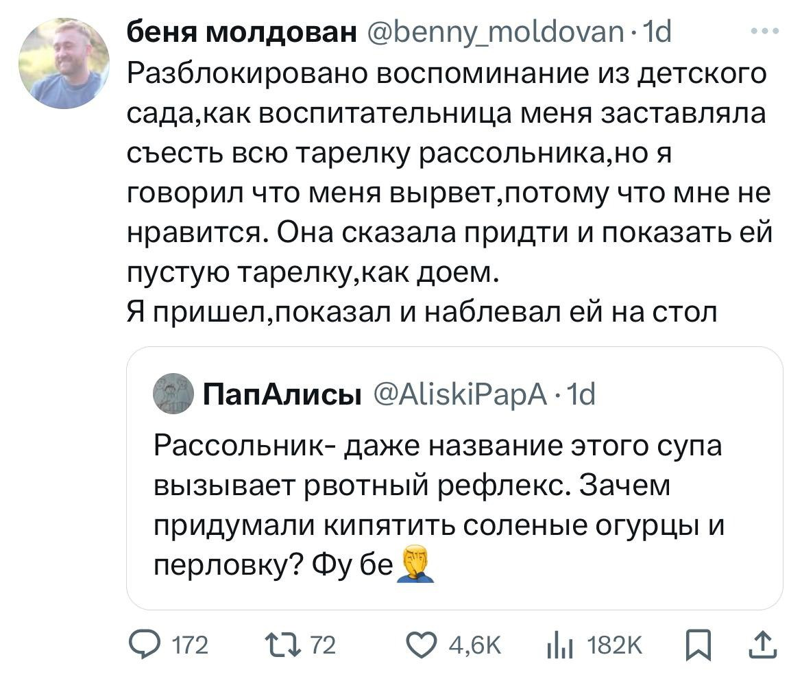 600 memen Юмор для всех и каждого Человек слова2 11 месяцев назад из тг memento life Детский сад X (Twitter) Детство Скриншот Telegram (ссылка) Рассольник Воспитатели Рвота 24 18 6 5 Ещё 0