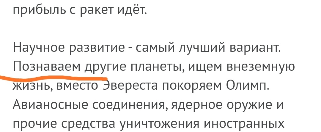 Научное развитие - самый лучший вариант. Познаем другие планеты, ищем внеземную жизнь, вместо Эвереста покоряем Олимп. Авианосные соединения, ядерное оружие и прочие средства уничтожения иностранных партнеров в рамках единого мира строить уже не надо, и ресурсы можно перенаправить на космическую сферу. Ну и очевидное для науки - заселяем другие планеты, чтобы если прилетит метеорит/комета или иной «конец света», то сохранить человечество как вид.