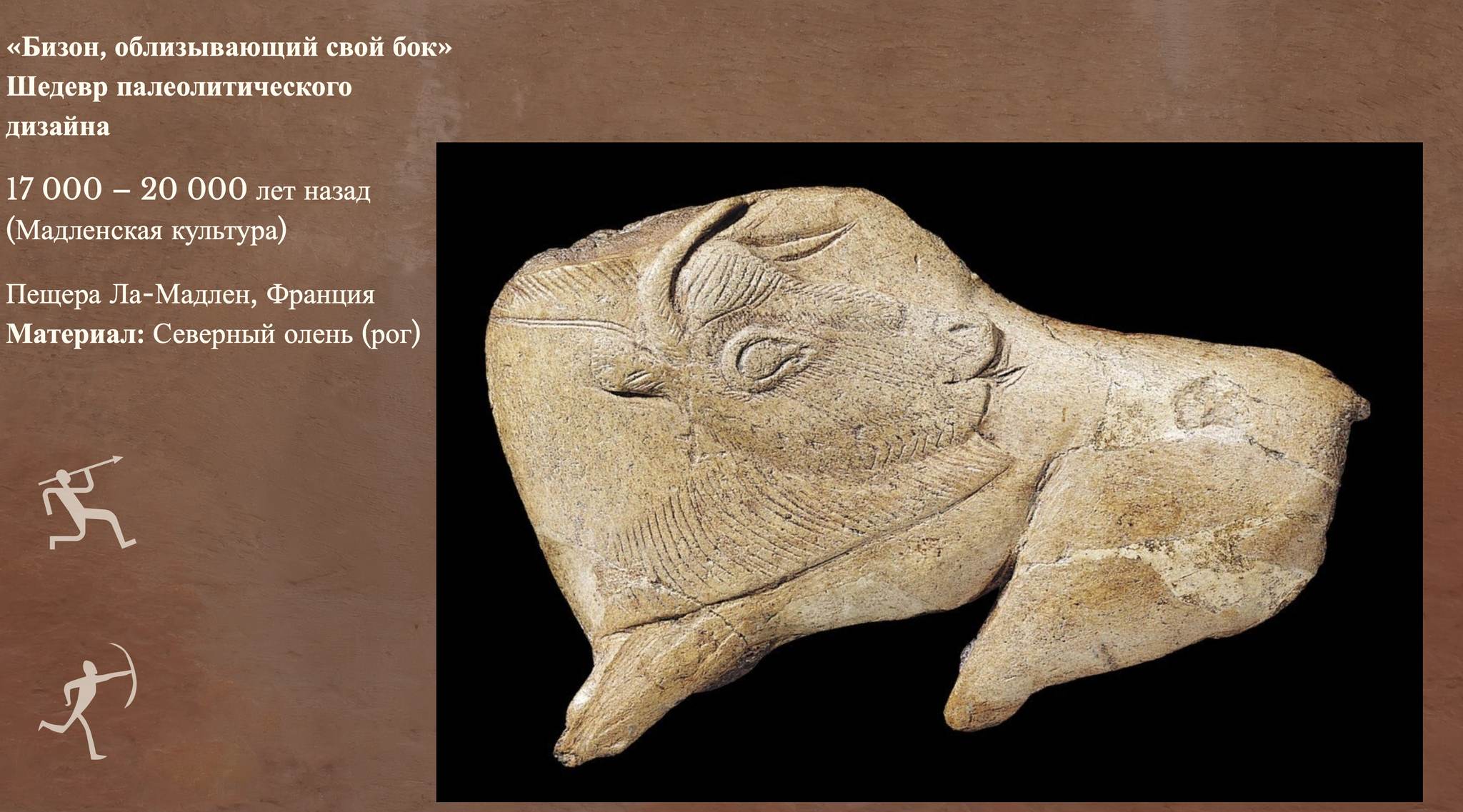 Это навершие атлатля (копьеметалки). Художник столкнулся с композиционной задачей: как вписать массивное животное в узкий и короткий обломок рога? Решение было найдено через движение — мастер развернул голову бизона на 180 градусов, изобразив, как зверь чистит шерсть.