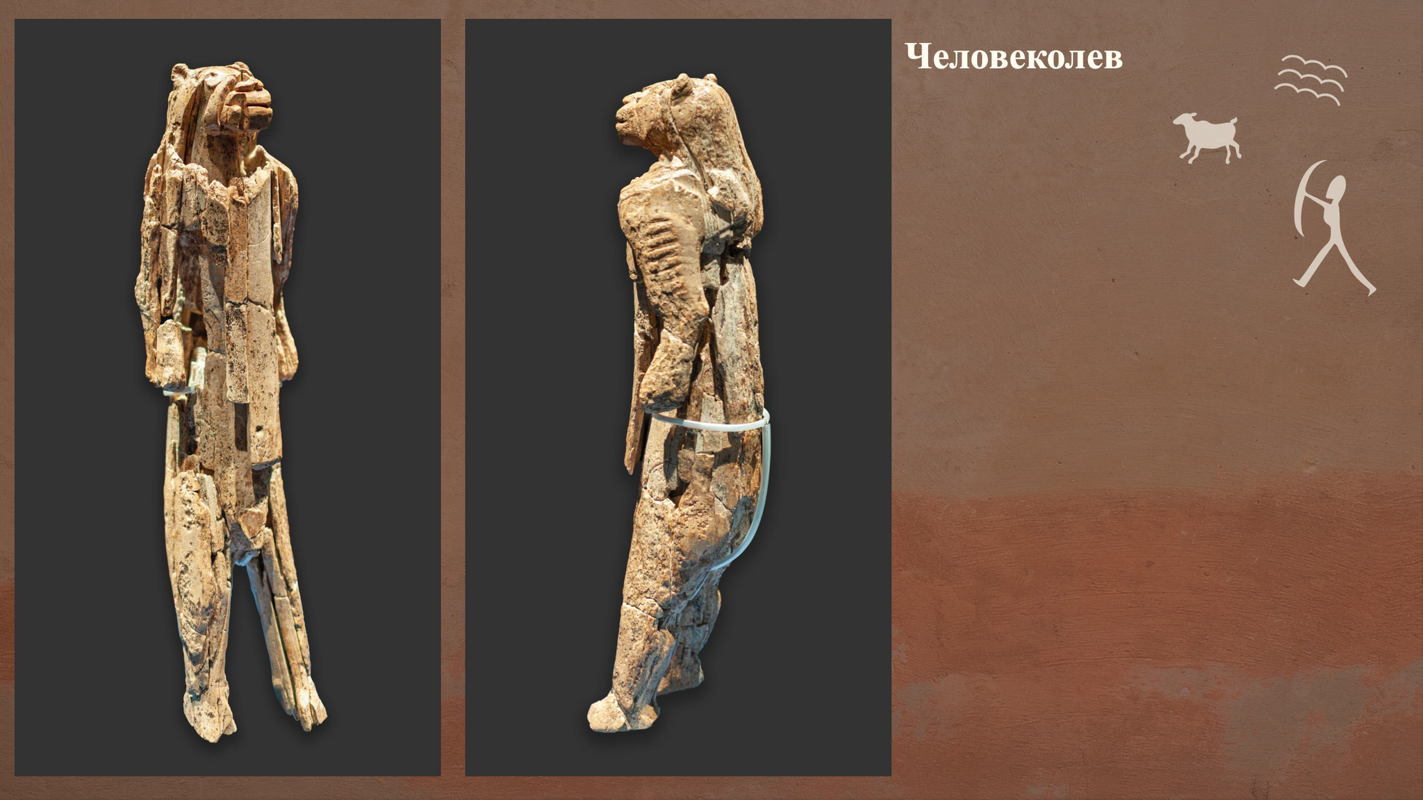 Первый экспонат это Человеков. Статуэтка из пещеры Штадель в Германии — это старейшее изображение существа, которого не существует в природе. Её возраст составляет 40 000 лет. Фигура высотой 31 см вырезана из бивня мамонта и представляет собой гибрид: голову пещерного льва на вертикальном человеческом теле.